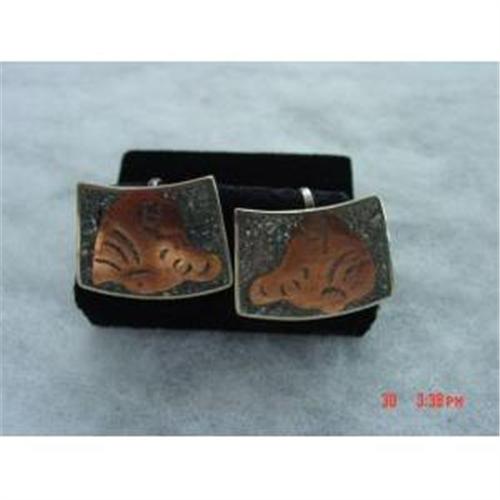 Here is a very rare signed by the designer Mexican 1940s pair of I believe it is called Married metal earrings. These are screwback and signed something like STERLING 0925 CB H CE HECOEMET CO? lOS cASTILLO DID THIS MARRIED METAL WORK WITH COPPER AND HE DOES HAVE THE EAGLE MARK 38 They are in perfect condition and have the copper or Married Metal inlay on the front, there is inlay of turquoise and other stones around these, I thought these were rare cuff links at first but they are earrings. They are 1 1/4 inches wide