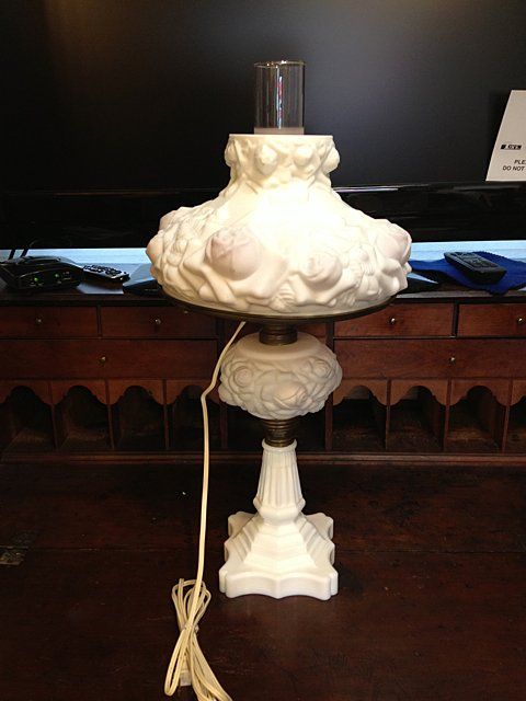 Estate Lamp Attributed to Fenton Glass. Measures approx. 22 inches to top of chimney. Shade measures 10 1/2 inches wide. Estate attributed to Fenton Glass, very unusual blown out roses on shade and on the base. Case glass pink, satin glass inside, very uncommon lamp to find today in complete excellent condition. Brass ring needs to be resoldered only - nothing is broken.