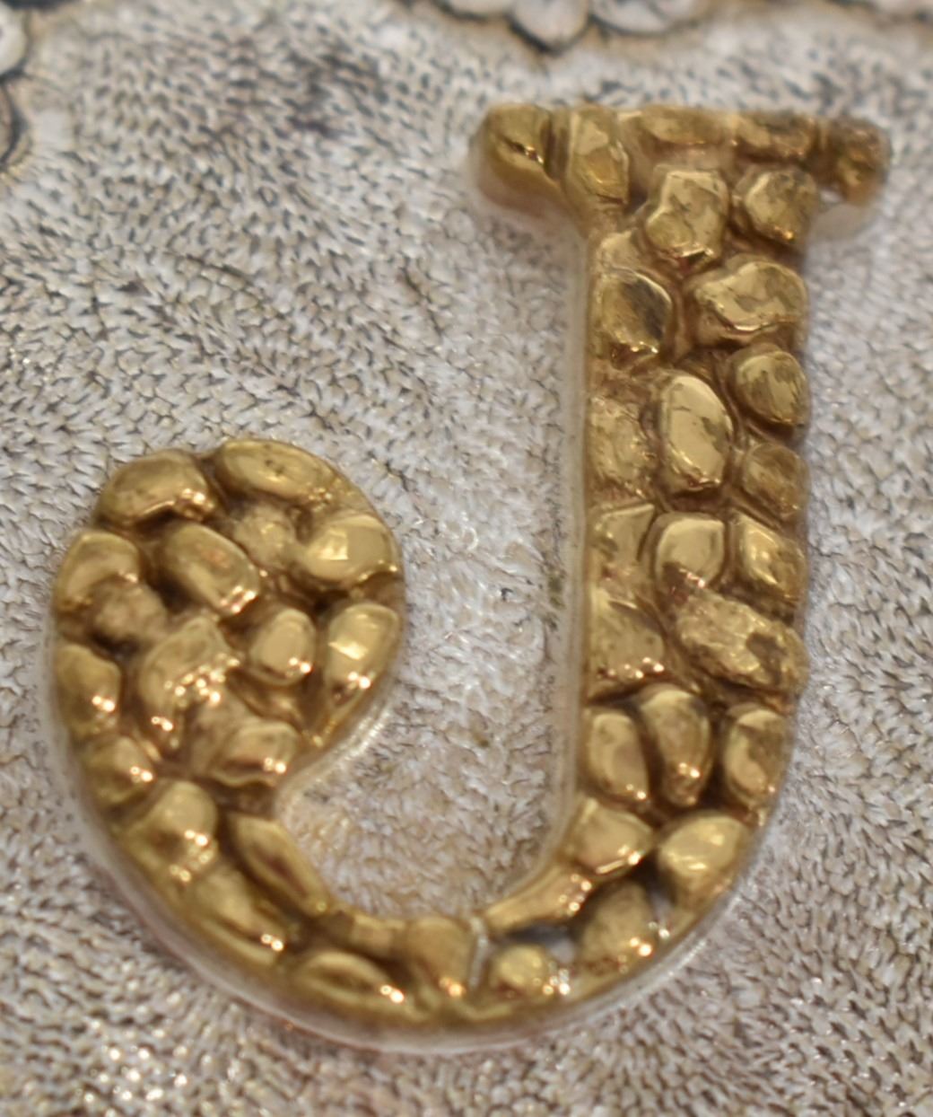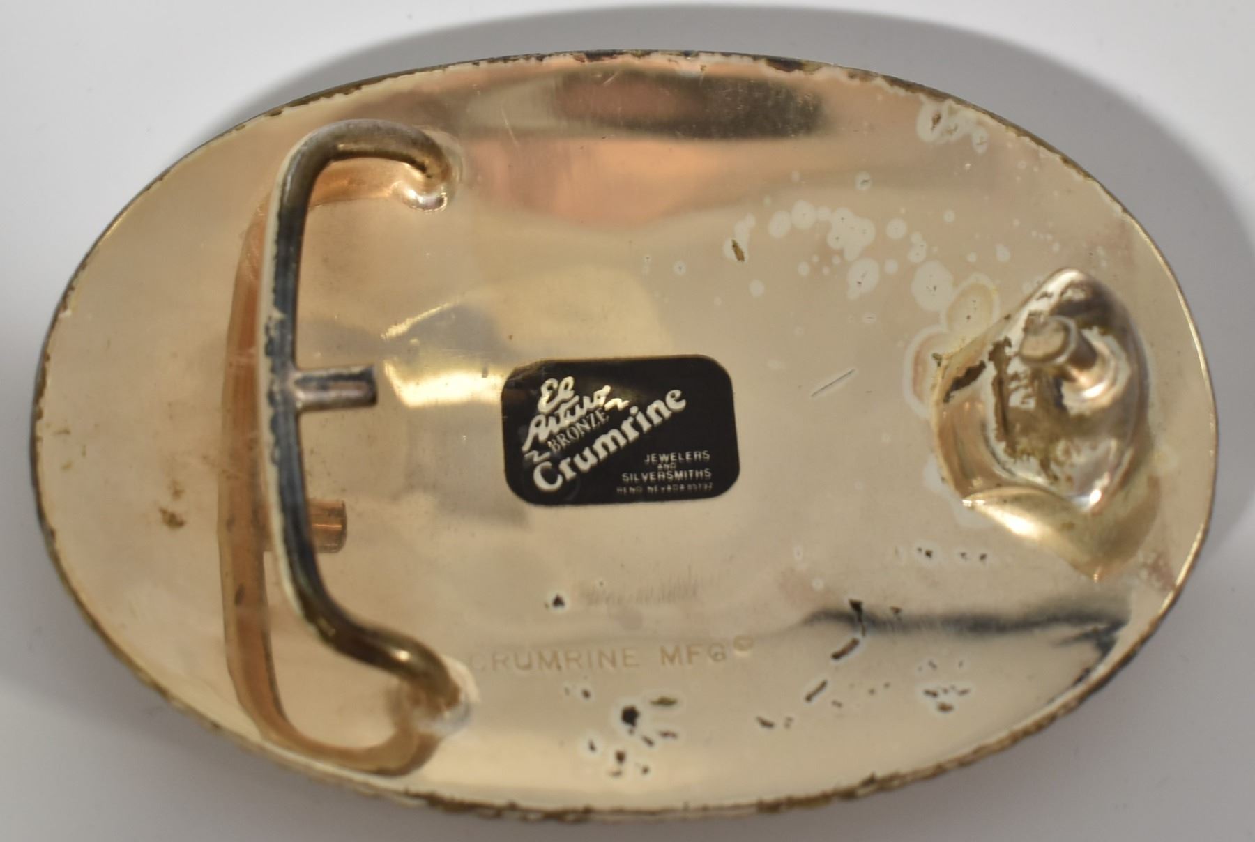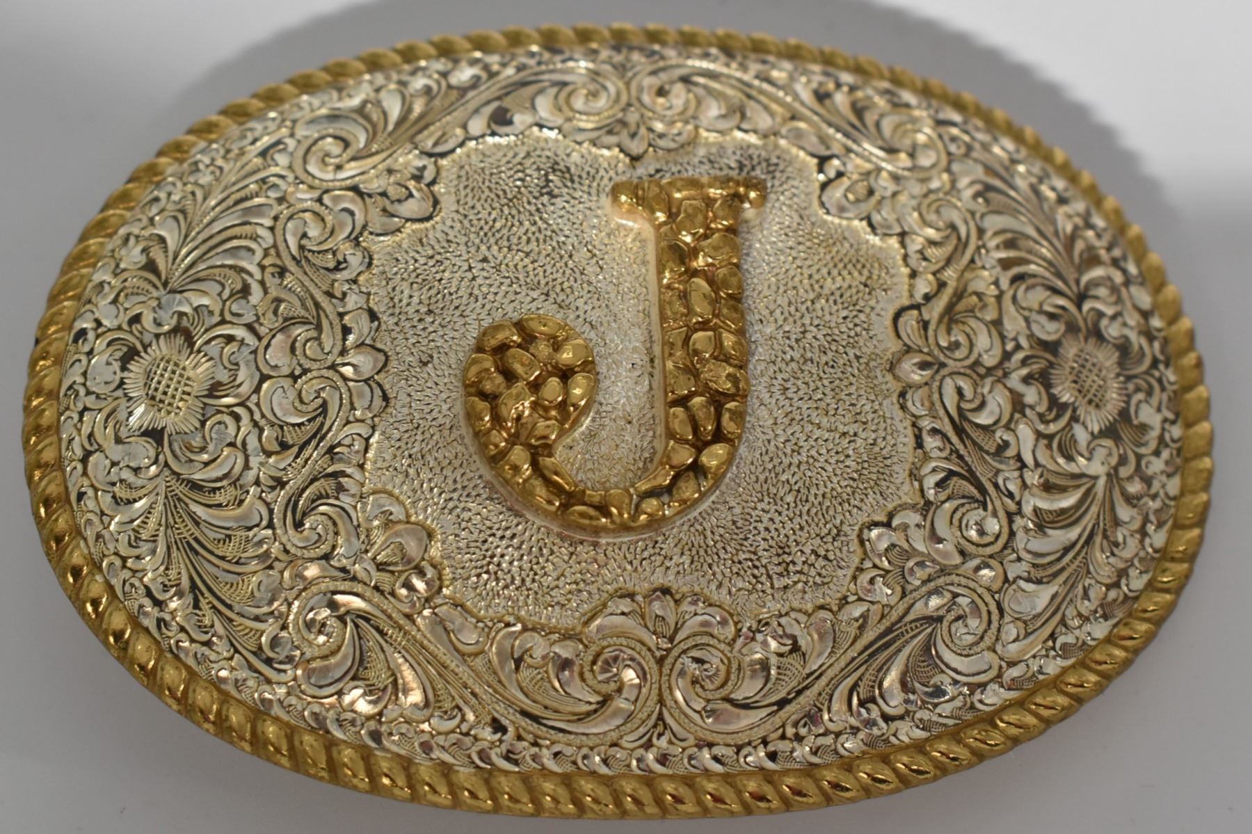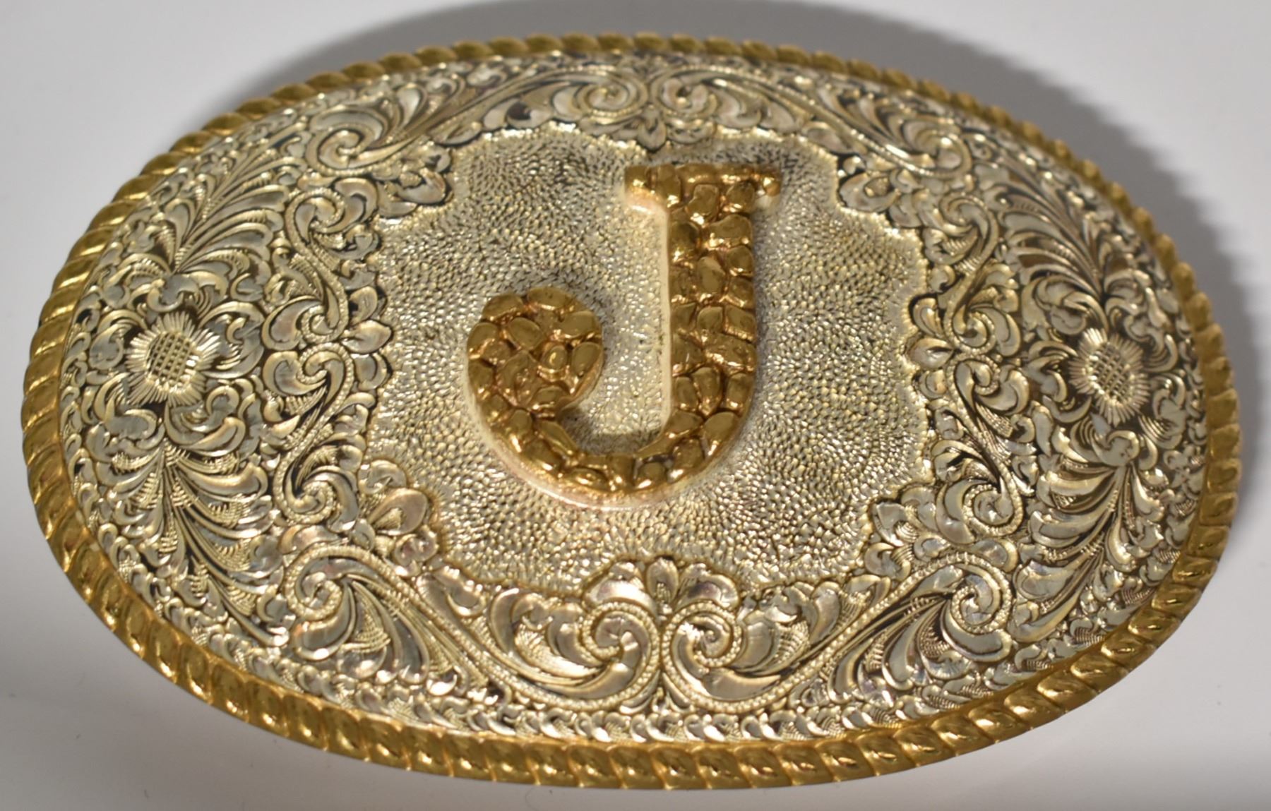 Estate Large El Arturo Bronze Initial ''J'' Buckle, made by Crumrine Jewelers and Silversmiths Reno NV, measures 3'' x 4'' and is marked on the back, has original foil label on back also, total gram wt. of 110.3