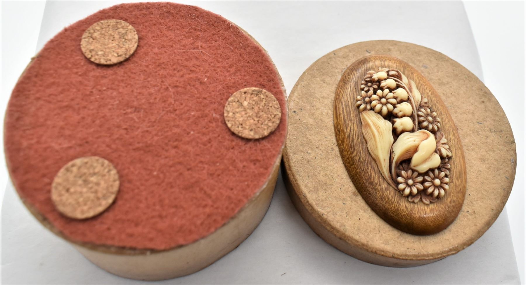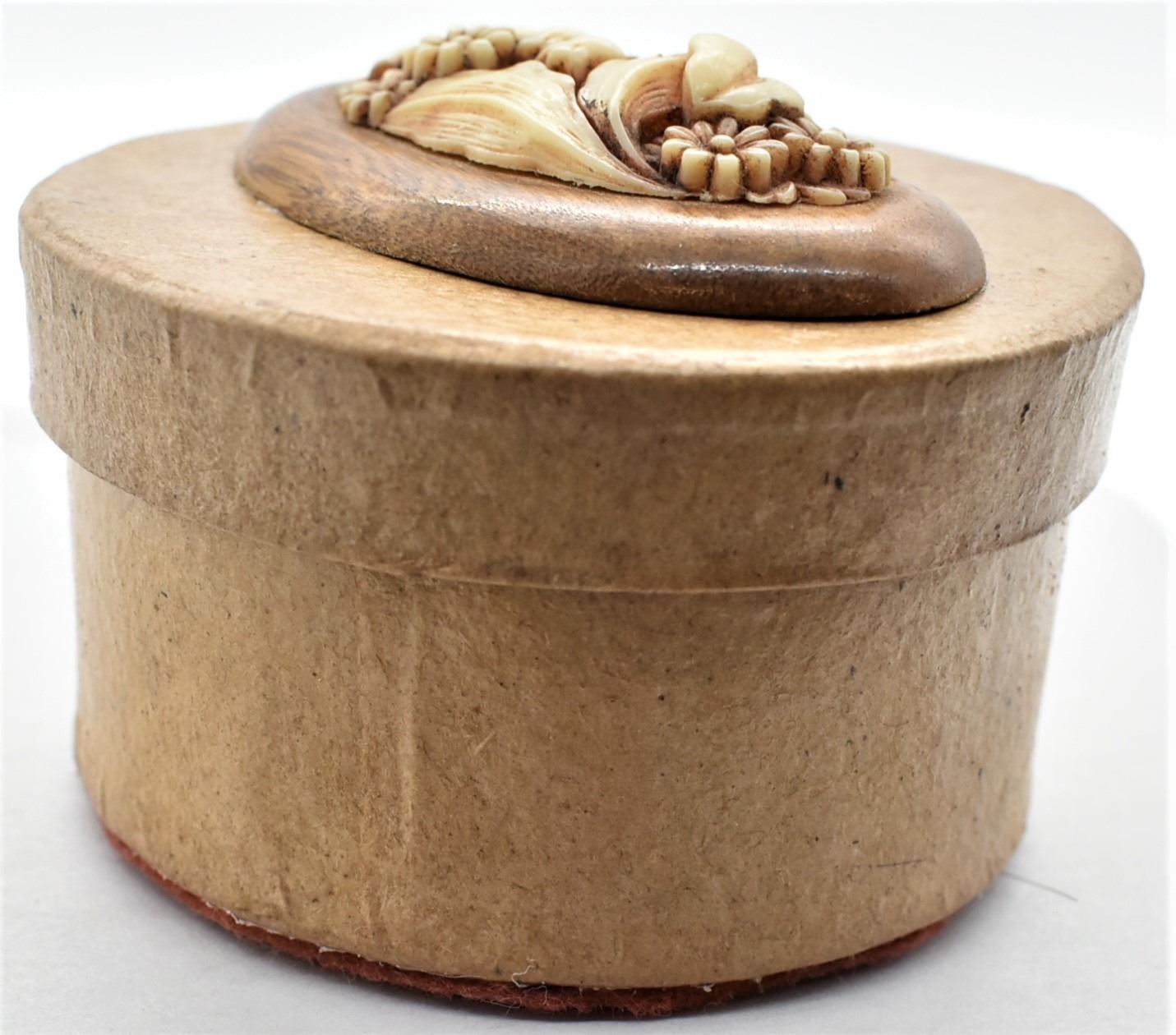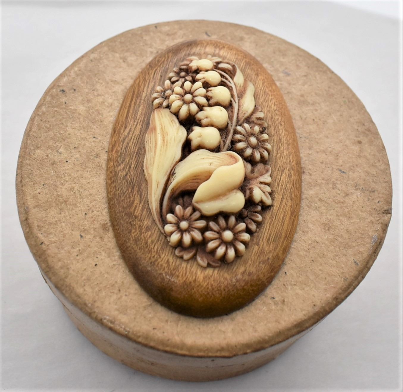 Estate Lidded Trinket Box, felt lined, wood and carved bone embellishment on top, box appears to be paper mache