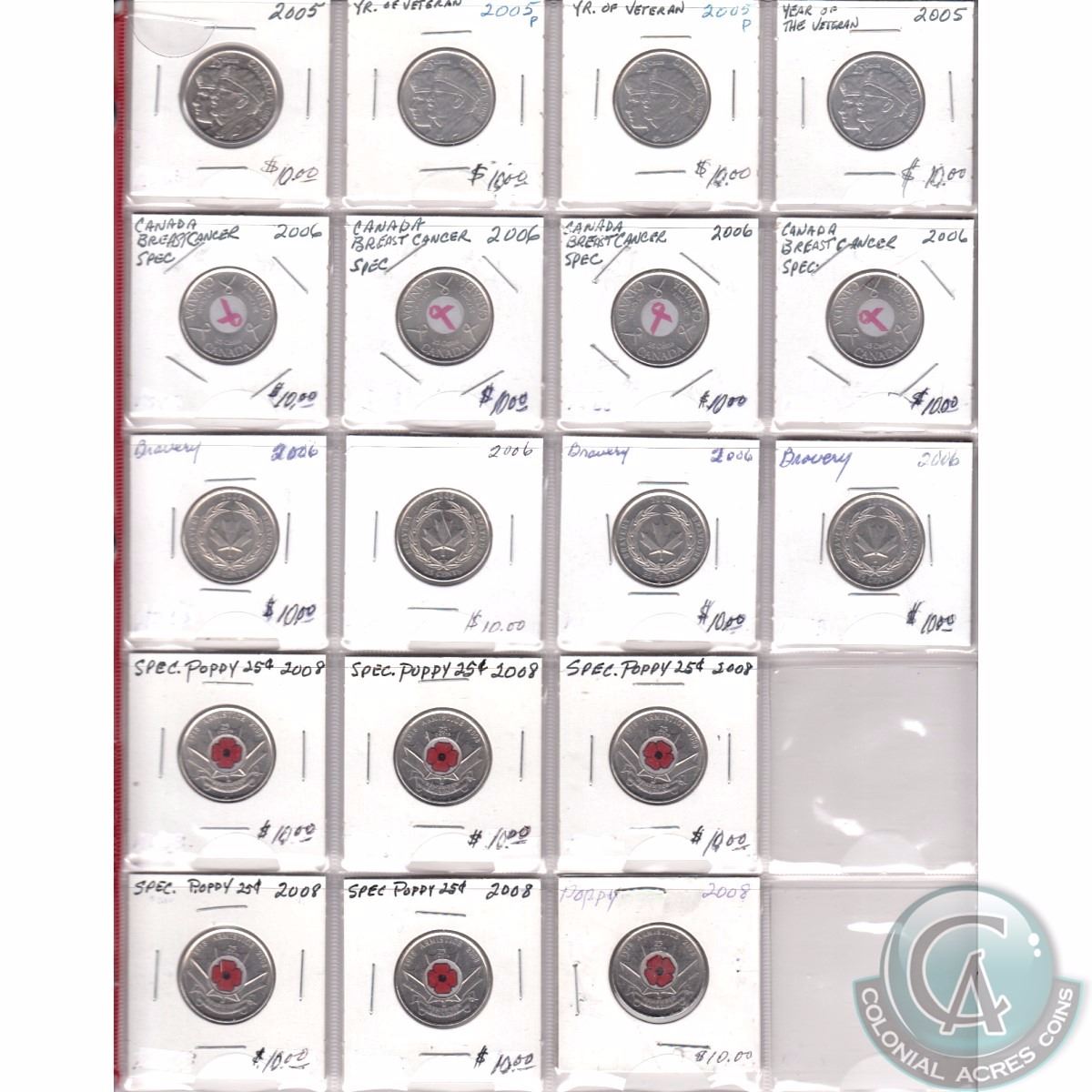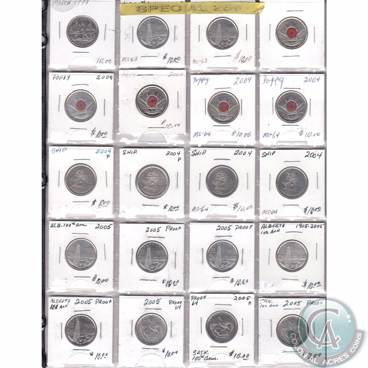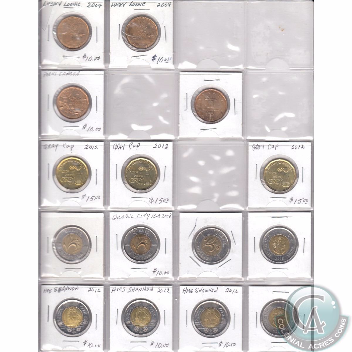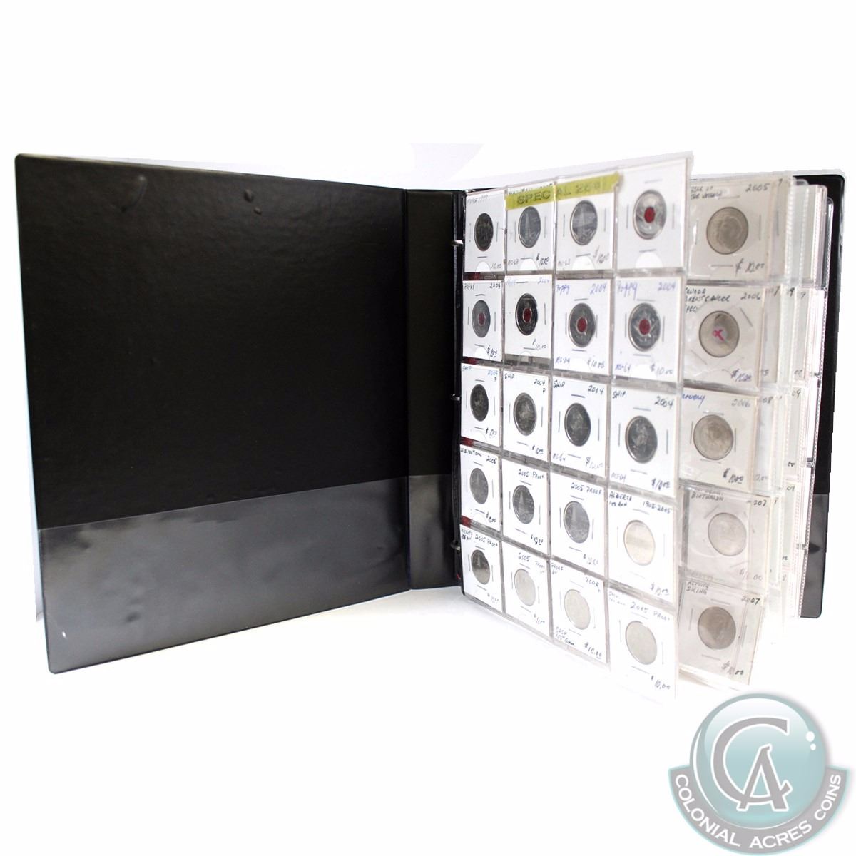 Estate Lot Binder of 158x Canada Commemorative 25-cent, Loon $1 & $2 in 2x2's and Plastic Pages Dated 1999-2016. You will receive 126x 25-cent, 24x Loon $1 & 8x $2 with some coins coloured. 158pcs