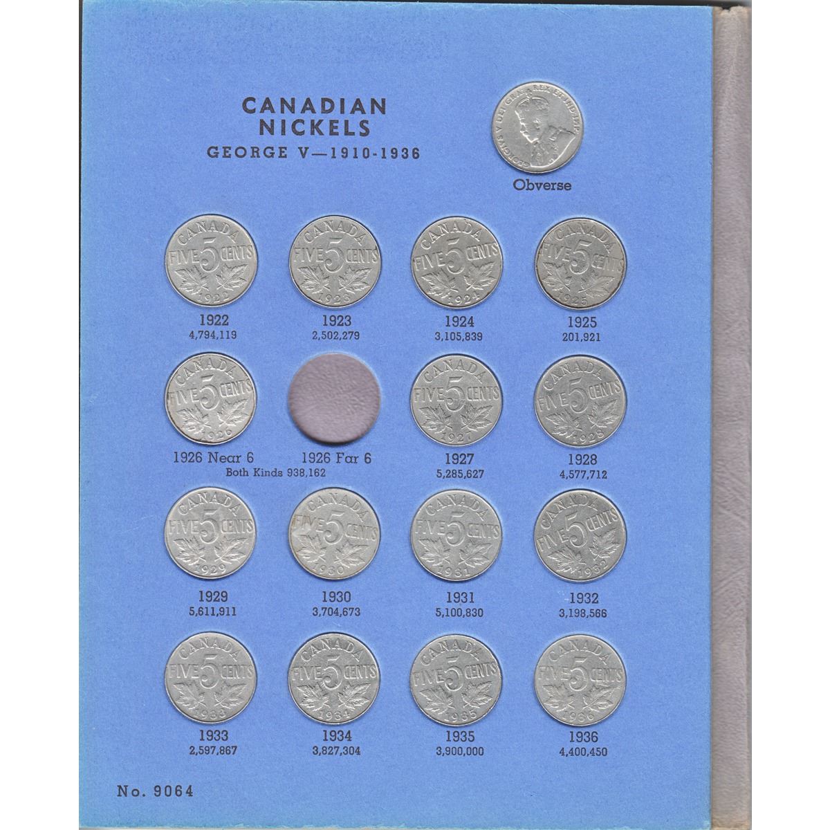 Estate Lot: Canadian Nickel Collection 1922-Date Blue Book Containing 42x 5-cent Dated 1922-1960, excluding 1926 Far 6. Includes the scarce 1925 and 1926 Near. Buyers Premium will be added on all items as per our terms of sale. We accept Paypal, Credit Card, E-Transfer Payments, Cheque or Money Orders (there is an additional 3% fee for using Paypal or Credit Card). All invoices will be emailed immediately following the auction, please contact us if you would like to pay by credit card or receive a new revised lower total for mailing in payment or sending an e-transfer (3% discount). All Items Are Sold "AS IS", no returns