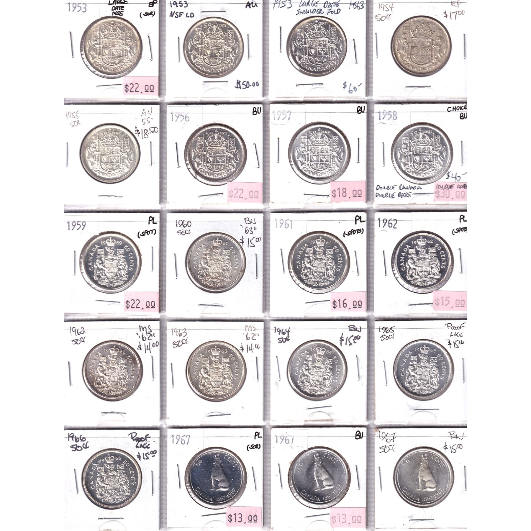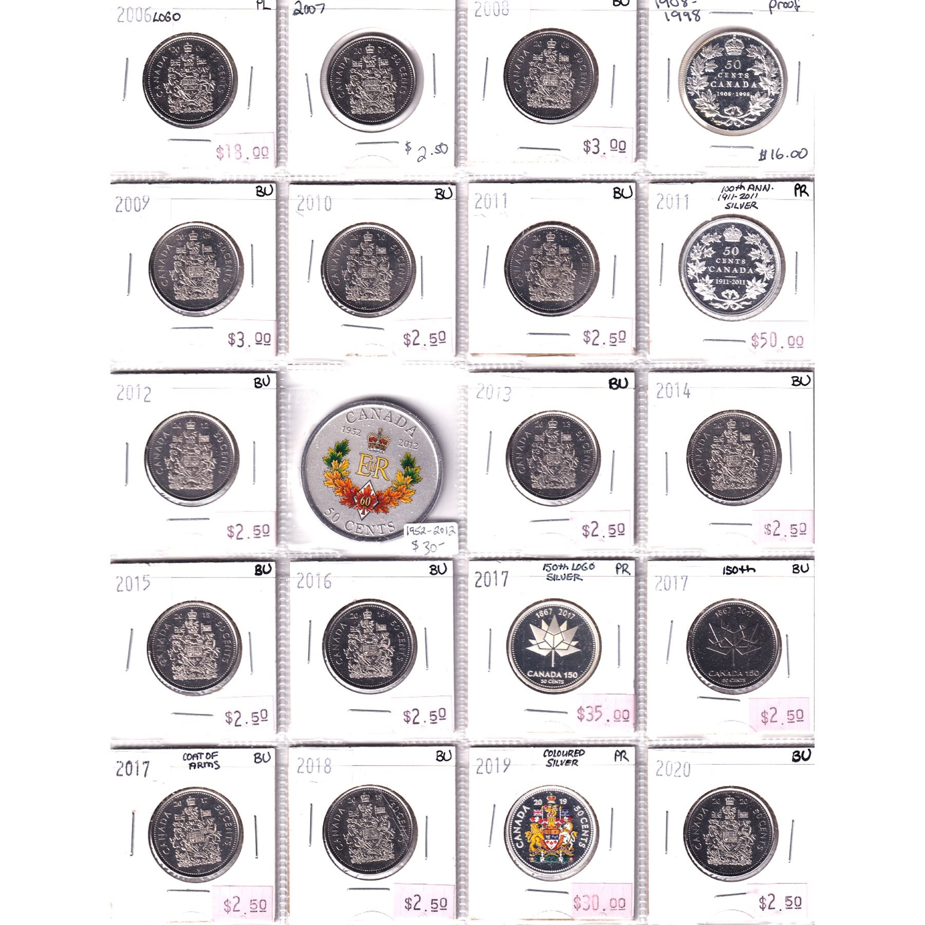 Near complete 50-cent Collection from 1953-2020. Lot includes 24x Silver 1953-1967 plus 1908-1998 Silver Proof, 1911-2011 Silver Proof, 1953-2012 Silver Plated Colourized, 1867-2017 Silver Proof, & 2019 Coloured Silver Proof. Set includes 1x every date from 1968-2020 plus some varieties like 1978 Round Jewels, 2006 Logo PL, 2003 WP PL, & 2004P SP. A great assortment for someone looking to complete their 50-cent collection.