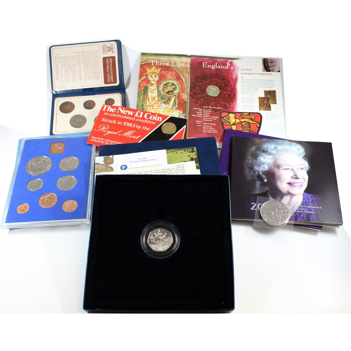 Estate Lot Great Britain Coin Collection. You will receive Britain's First Decimal Coins in blue folder, 1977 Coins of Great Britain and Northern Ireland in original packaging, 1983 The New 1 Pound Coin in Display folder, 1994 50th Anniversary of D-Day in original Display, 1997 Brilliant Uncirculated 1-Pound Coin in Display folder, and 2006 80th Anniversary of Queen Elizabeth Crown in Folder (packaging is damaged). 6pcs.
