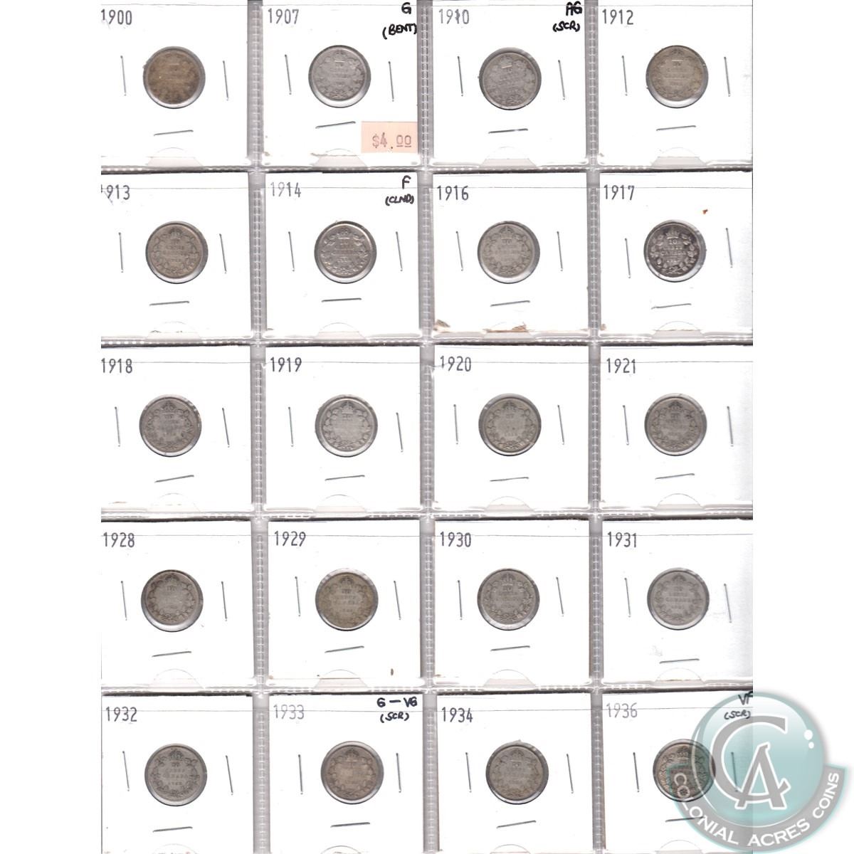 Estate Lot: Mixed Page of 20x Canada Silver 10-cent dated 1900 to 1936. 20pcs.