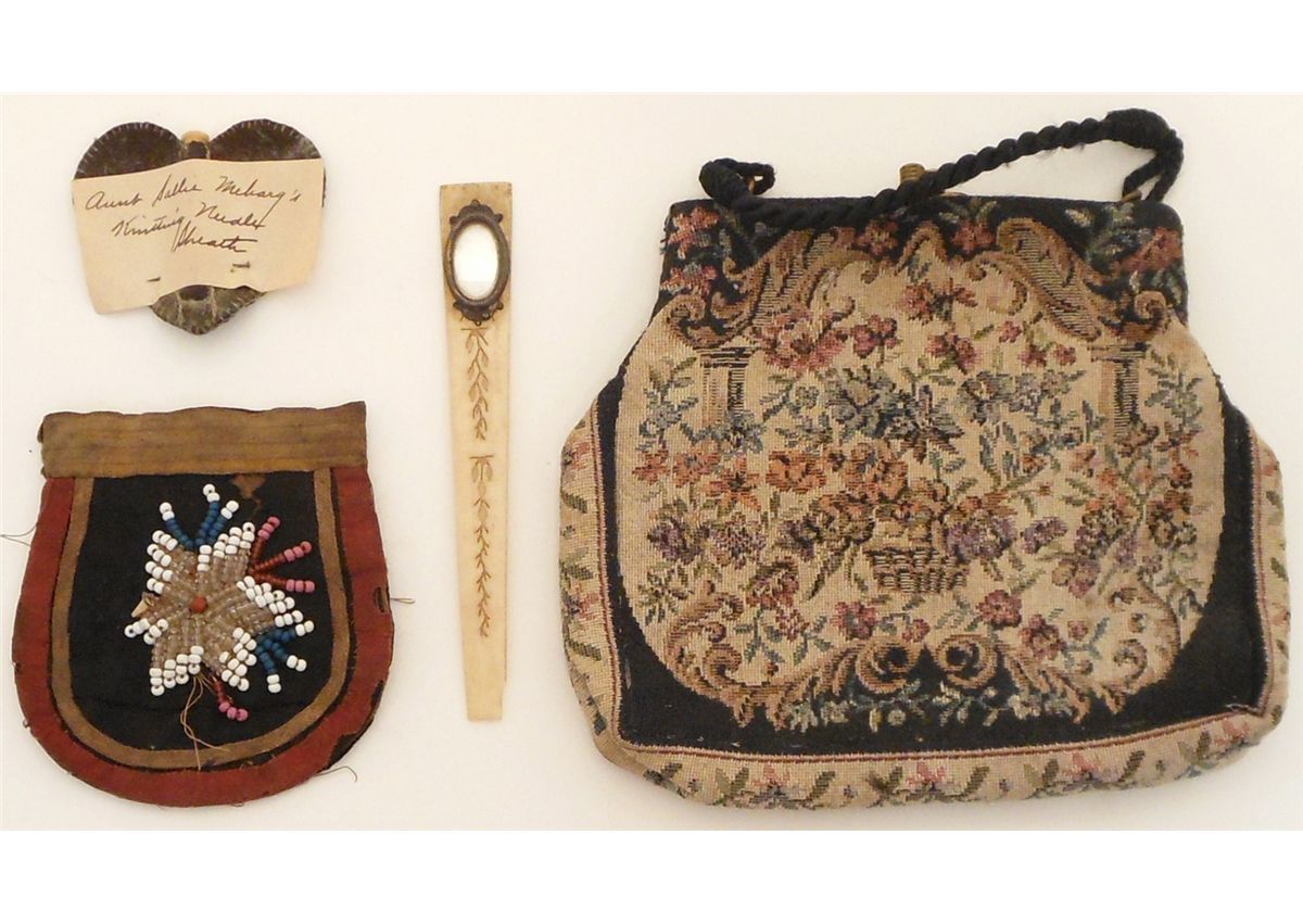 Small Beaded Purse. Tapestry Purse. Knitting Needle Sheath. Ivory Bookmark with Mirror. All are in Good used Condition with some light damage and signs of use and wear. (See Pictures to Determine Condition)