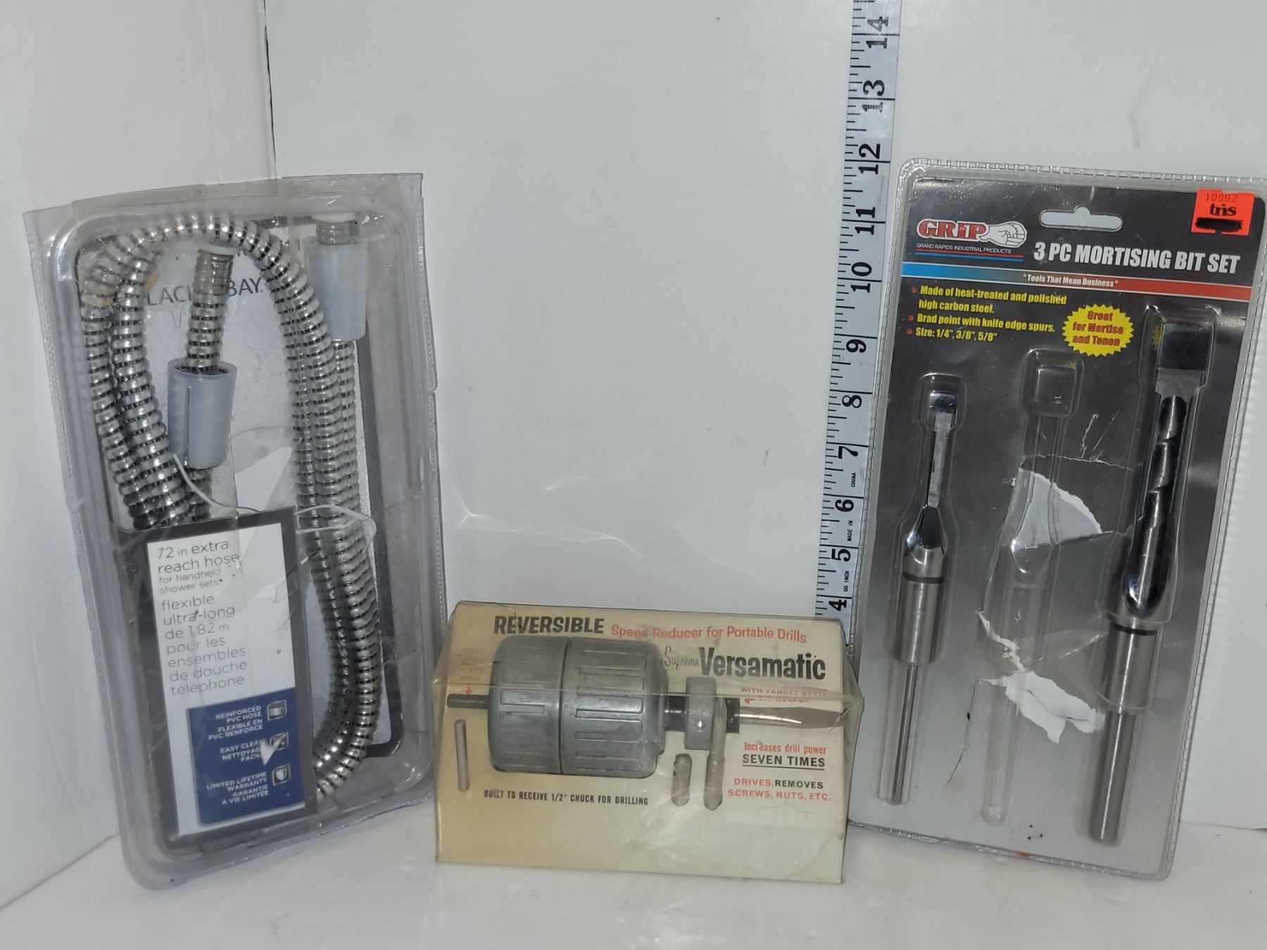 Estate Lot - Shower Reach Hose, Reversible Speed Reducer; Mortising Bit Set (1 missing)