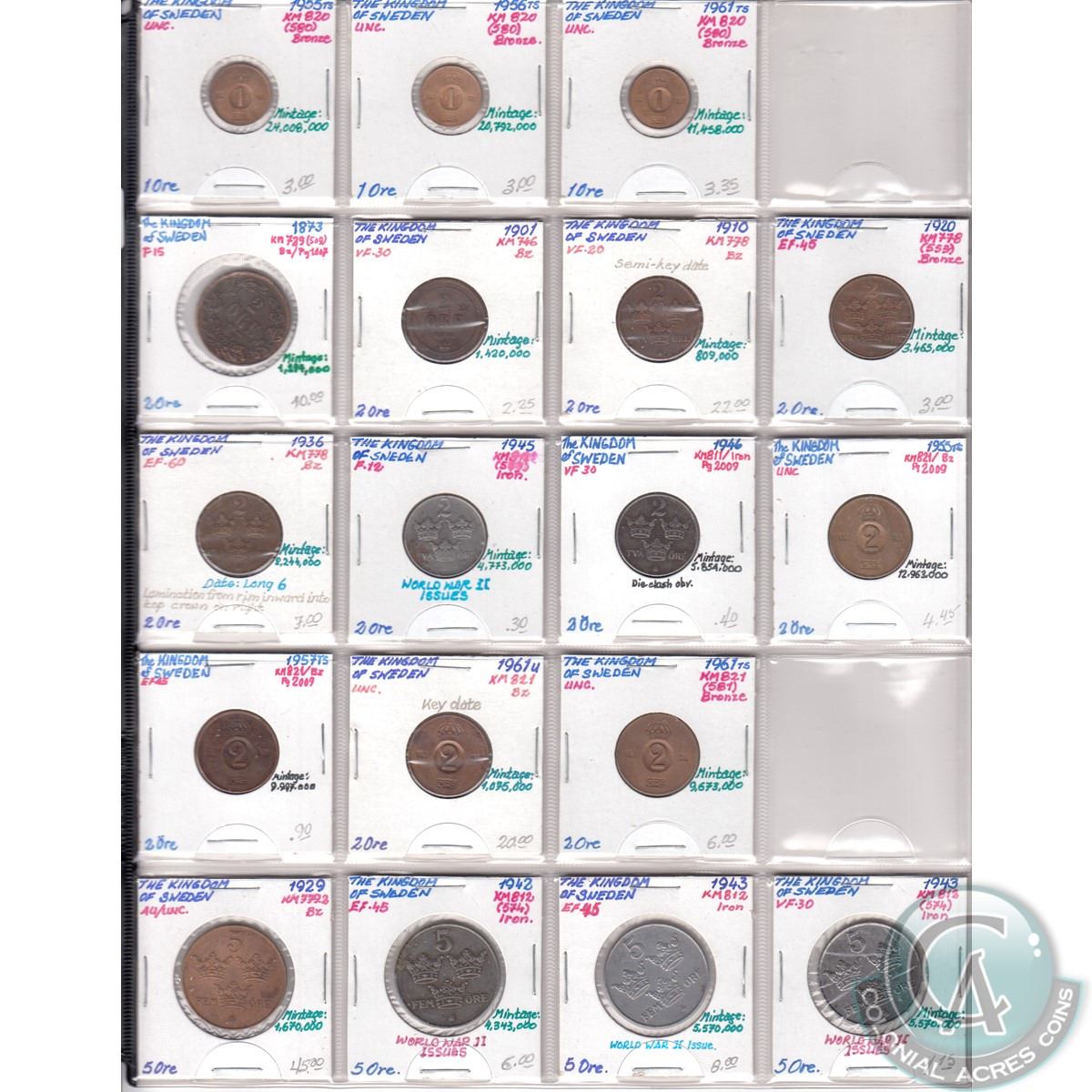 Estate Lot The Kingdom of Sweden Mixed Coin Collection. Dates range from 1873 to 1961. Page sold as is. Please view image (18pcs)
