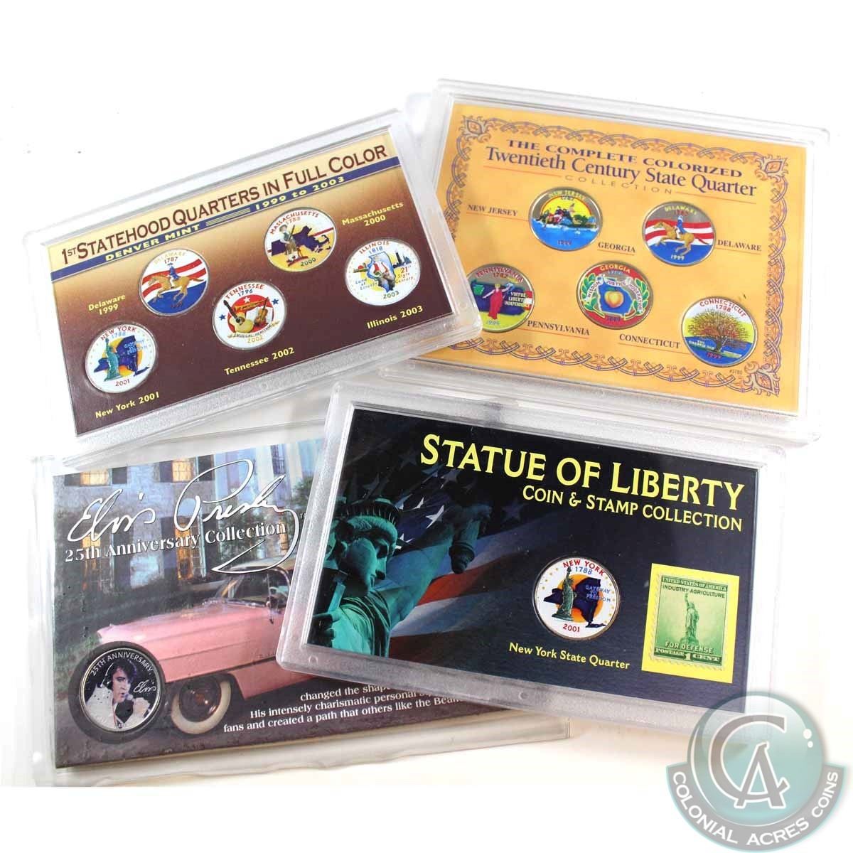 Estate Lot; United Stated Coloured Quater Collection. You will receive the following, 2001 Statue of Liberty Coin and Stamp Set, Elvis Presley 25th Anniversary Coin and Stamp Set, 1999-2003 Denver Mint 5-Coin Set, and 1999 Twentieth Century 5-Coin Set (cracked holder) . 4pcs.