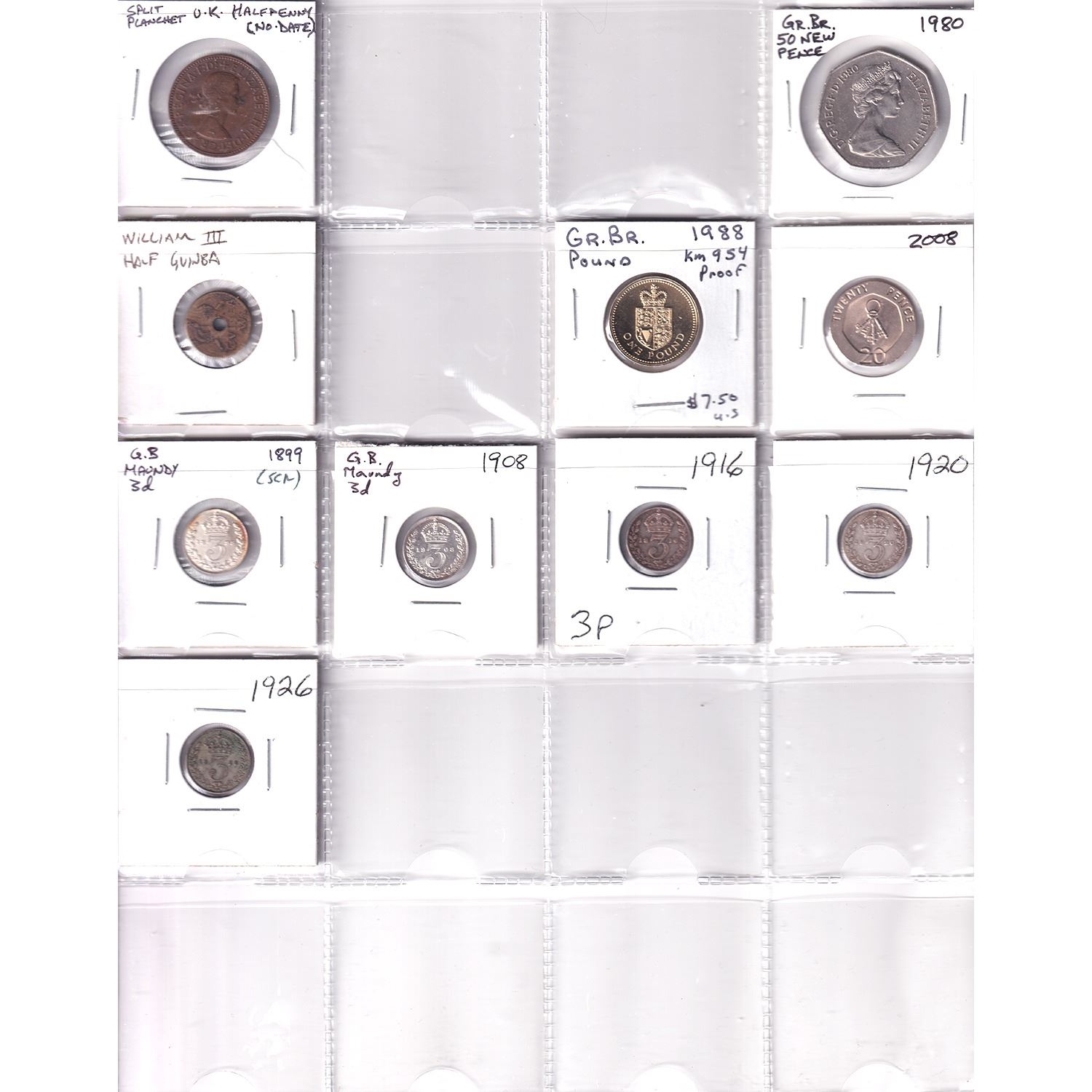 Estate Lot of 10x 1899-2008 Great Britain & Gibraltar Miscellaneous Coinage. You will receive a split planchet half penny, William III half guinea, Maundy 3 pence dated 1899, 1908, 1916, 1920 and 1926, 1980 50 new pence, 1988 1 pound & 2008 Gibraltar 20 pence. 10pcs