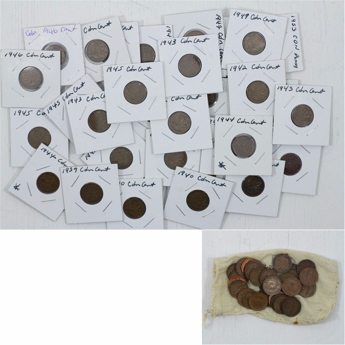 Estate Lot of 111x Canadian coins : 1-cents include 1927, 1939, 1940 x 4, 1941, 1942 x 4, 1943 x 3,