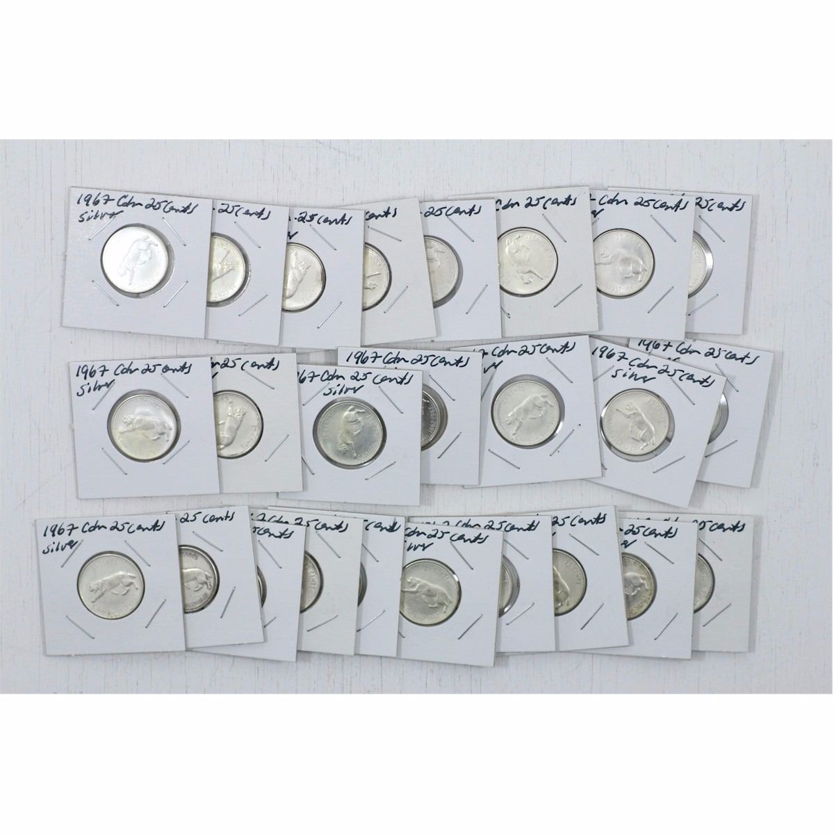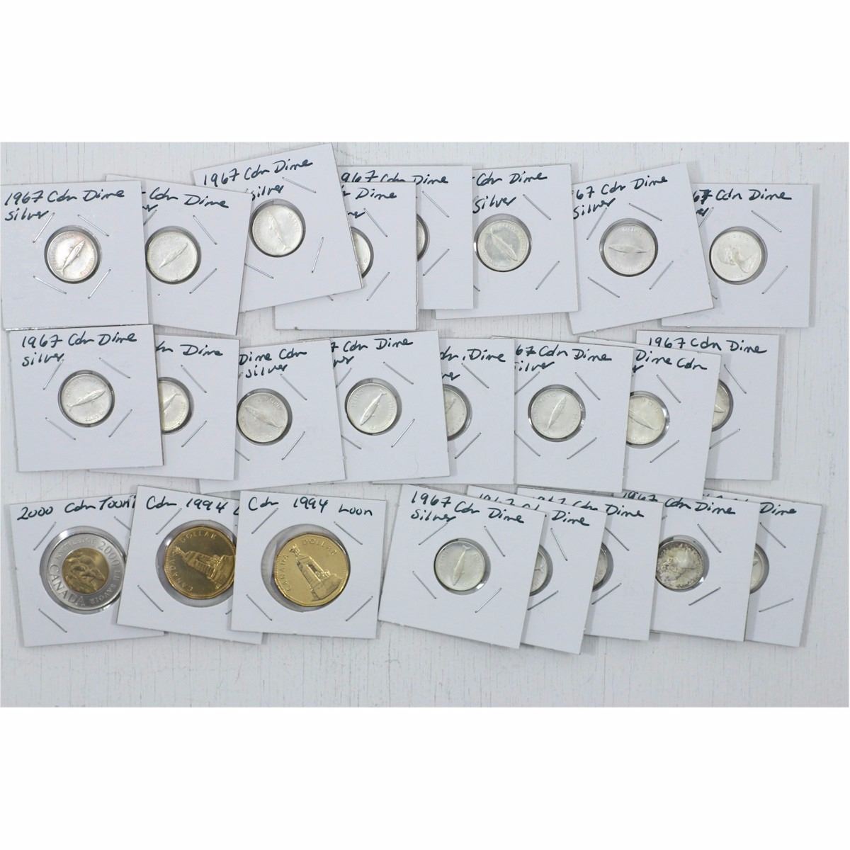 Estate Lot of 111x Canadian coins : 1-cents include 1927, 1939, 1940 x 4, 1941, 1942 x 4, 1943 x 3, 1944 x 3, 1945 x 4, 1946 x 2, 1947 x 3, 1948 x 1, 1949 x 1, 1953 NSF; PLUS The L McBrine Co. Limited Kitchener cloth bag of 31 pennies (mostly 1950-1951); PLUS 21 x 1967 Silver Ten Cents (nice grades); PLUS 25 x 1967 Twenty-Five Cents (nice grades); PLUS 2 x 1994 UNC War Memorial Loonies; PLUS 1 x UNC 2000 3-Polar Bears Knowledge Twoonie. Buyers Premium will be added on all items as per our terms of sale. We accept Paypal, Credit Card, E-Transfer Payments, Cheque or Money Orders (there is an additional 3% fee for using Paypal or Credit Card). All invoices will be emailed immediately following the auction, please contact us if you would like to pay by credit card or receive a new revised lower total for mailing in payment or sending an e-transfer (3% discount). All Items Are Sold "AS IS", no returns
