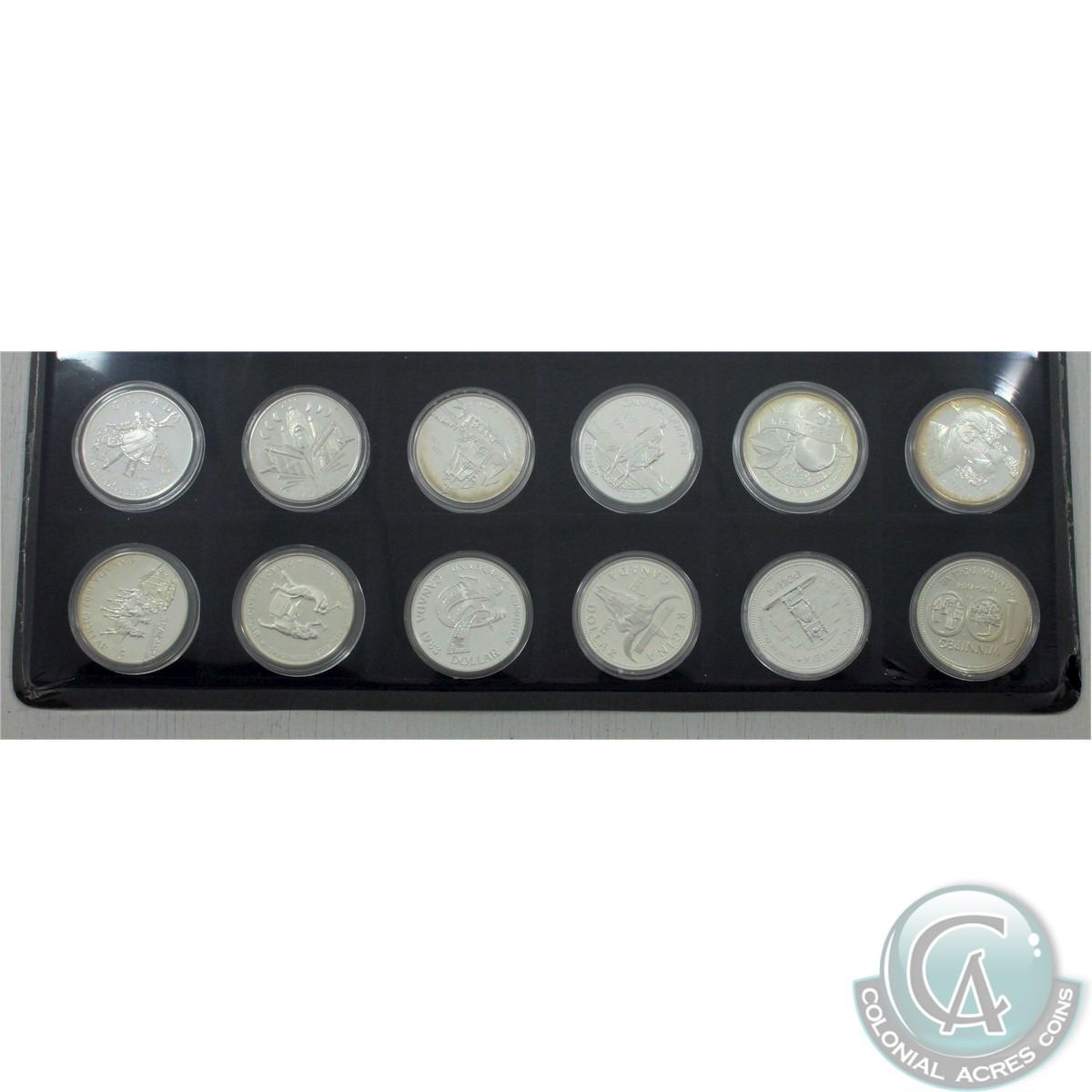 Estate Lot of 12x 1974-2001 Canada Proof Commemorative Silver Dollars in blue numis tray. This lot includes the 1974, 1977, 1982, 1983, 1988, 1992, 1995, 1996, 1998, 1999, 2000 & 2001. Some coins are toned. 12pcs. Has exactly 6.75oz. of pure Silver.