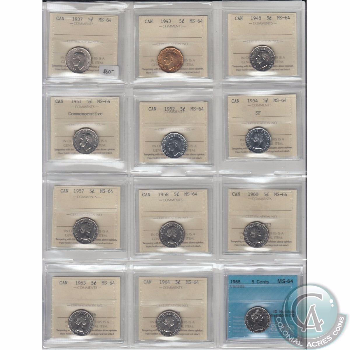Estate Lot of 12x Canada 5-cents All ICCS/CCCS Certified MS-64. This lot includes the following certified coins; 1937 ICCS, 1943 ICCS, 1948 ICCS, 1951 ICCS, 1952 ICCS, 1954 SF ICCS, 1957 ICCS, 1958 ICCS, 1960 ICCS, 1963 ICCS, 1964 ICCS and 1965 CCCS. All coins are Certified MS-64 (12pcs)