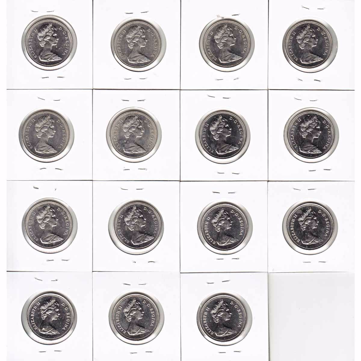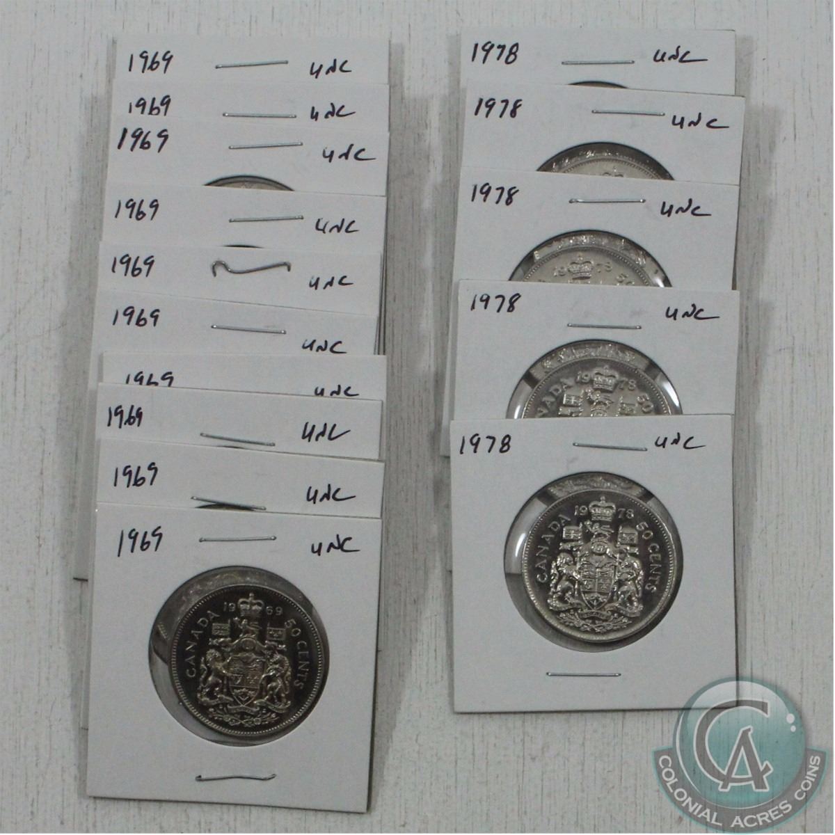Estate Lot of 15x 1969 & 1978 Canada Uncirculated 50-cent coins in 2x2 holders. You will receive 10x 1969 and 5x 1978 50-cent coins from an uncirculated roll (15pcs)