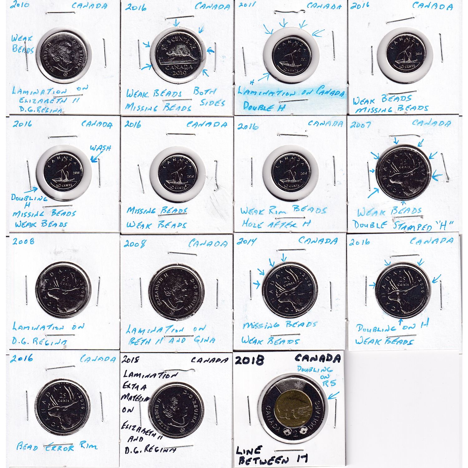 Estate Lot of 15x Canada Error Coinage in 2x2 Holders. You will receive 2x 5-cent, 5x 10-cent, 7x 25