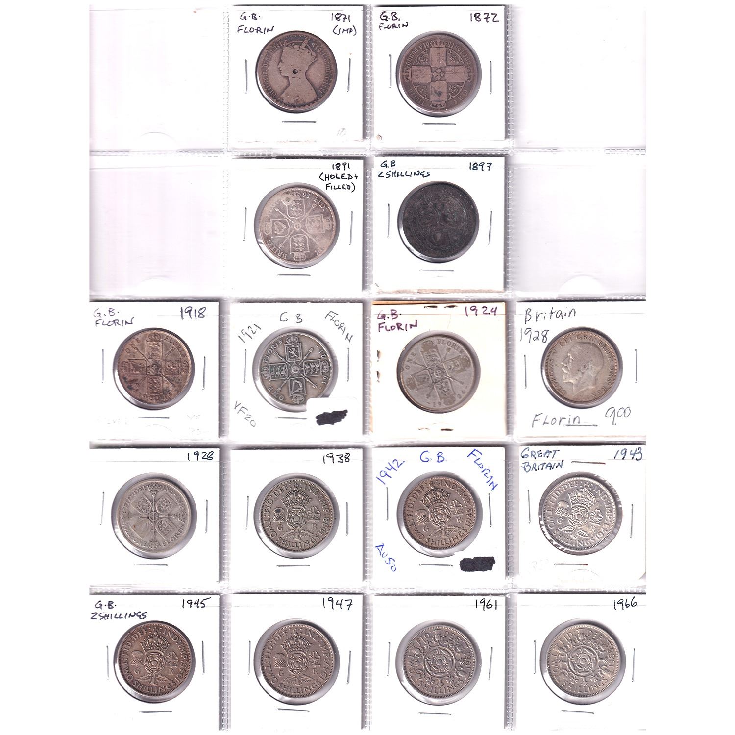 Estate Lot of 16x 1871-1966 Great Britain Florins. You will receive 1871, 1872, 1891, 1897, 1918, 1921, 1924, 2x 1928, 1938, 1942, 1943, 1945, 1947, 1961 & 1967. 16pcs