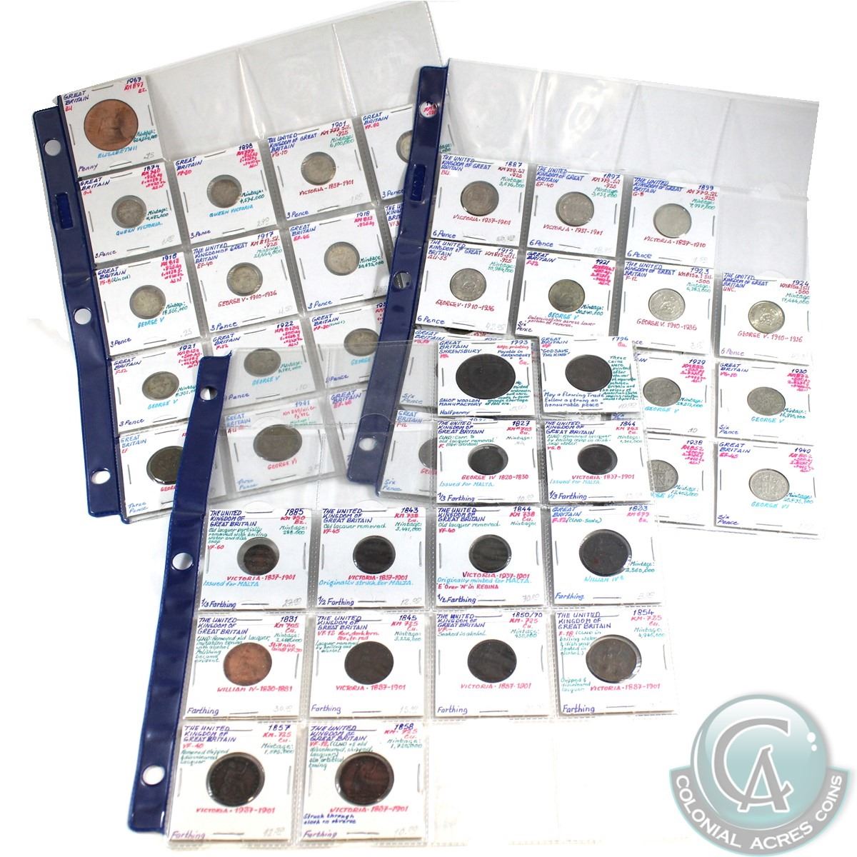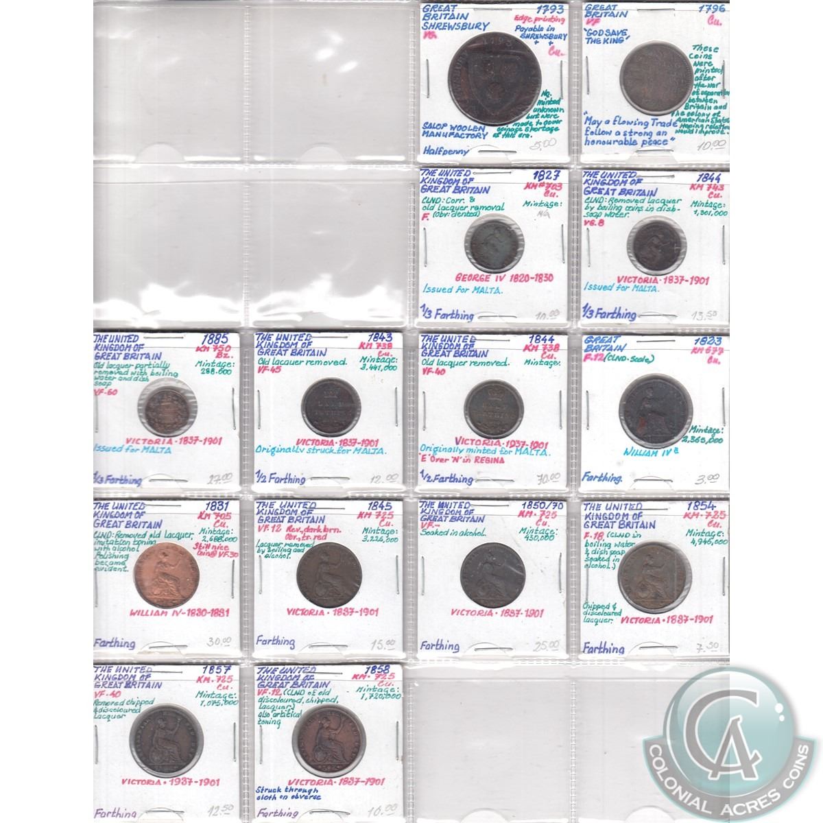 Estate Lot of 1793-1885 Great Britain Coinage of Various Denominations in Plastic Pages. 46pcs