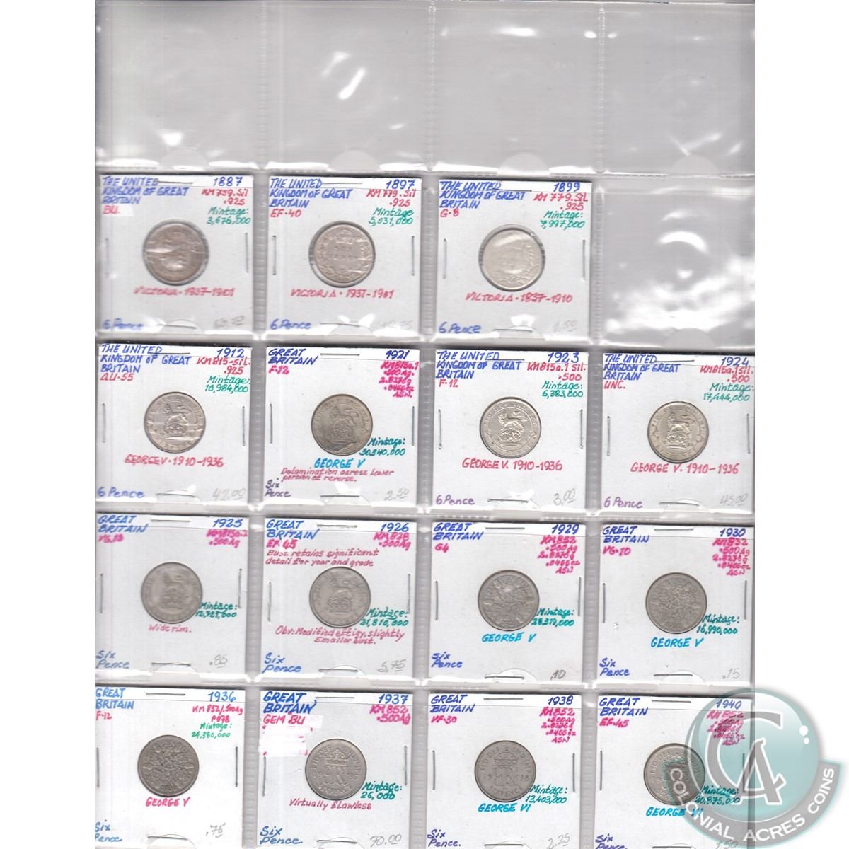The opening bid for all lots will commence at 10% above the second highest bid received or the consignor's reserve (whichever is higher). All mail bids received prior to the live auction will be lowered whenever possible (so don't be afraid to put down your maximum bid!!) All lots will be started at either the consignor's reserve or 50% of the estimate. Key Date and higher graded material generally will command a closing price close to or above the estimated price. If you place a bid of about 80% of the estimate you should have a good chance of winning the lot, while a bid of 100% of the estimate you will likely win the lot. All prices are in Canadian Funds. Bidding in this auction will be in Canadian Funds. Mail bids received from USA customers will be converted to CDN funds using the rate on the auction's date. All decisions by the Auctioneer are final and are made at the sole discretion of the Auctioneer. Colonial Acres Auctions is acting as an agent between the Consignors and the winning buyer. We the Auctioneer disclaims all responsibility and liabilities that may be connected to the sale of any items within our Auction. By agreeing to these terms you the bidder agrees to accept any damages, and or losses that may come from the purchase of an item in this sale.
