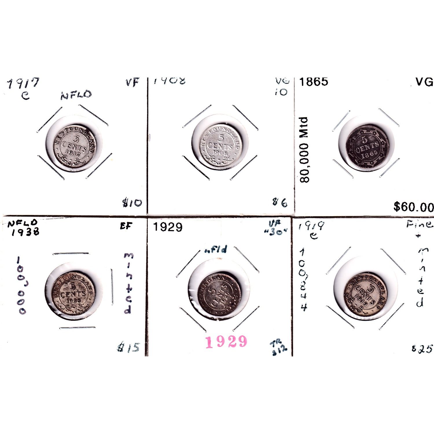 Estate Lot of 1865-1938 Newfoundland 5-cent in VG to EF. See image for included dates. 6pcs