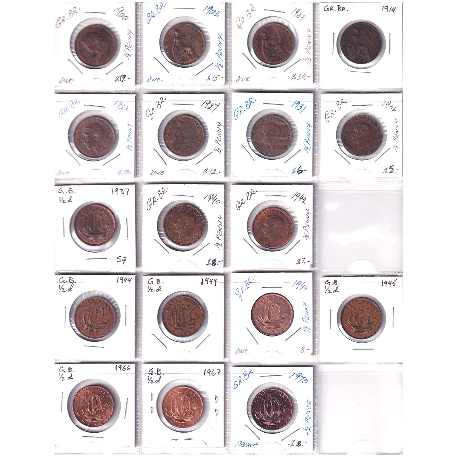 Estate Lot of 18x 1900-1970 Great Britain Half Pennies. You will receive 1900, 1902, 1903, 1914, 1922, 1927, 1931, 1936, 1937, 1940, 1942, 3x 1944, 1945, 1966, 1967 & 1970. 18pcs