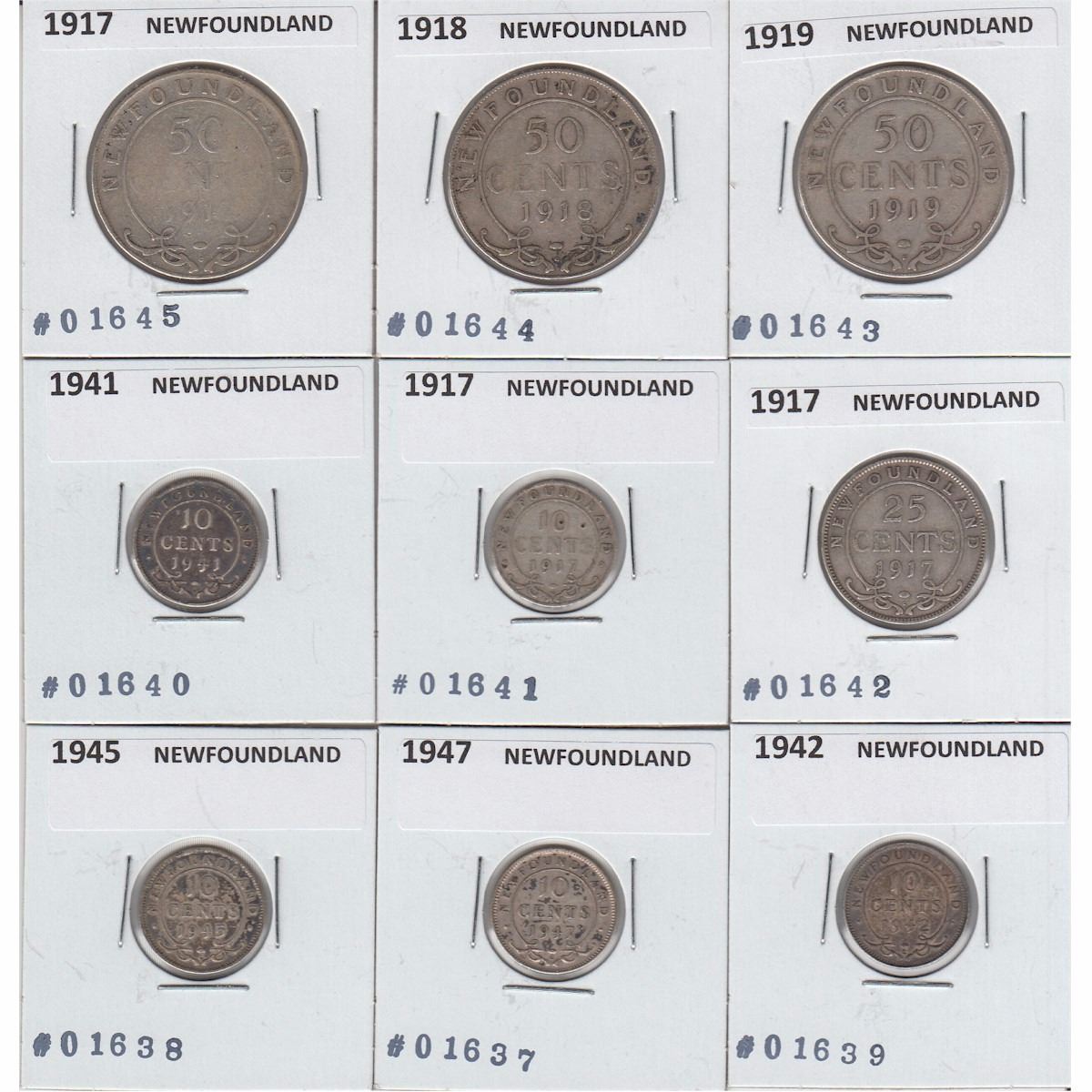 Estate Lot of 1917-1918 Newfoundland Silver coins (9 pieces). You will receive 1917 10c, 1941 10c, 1