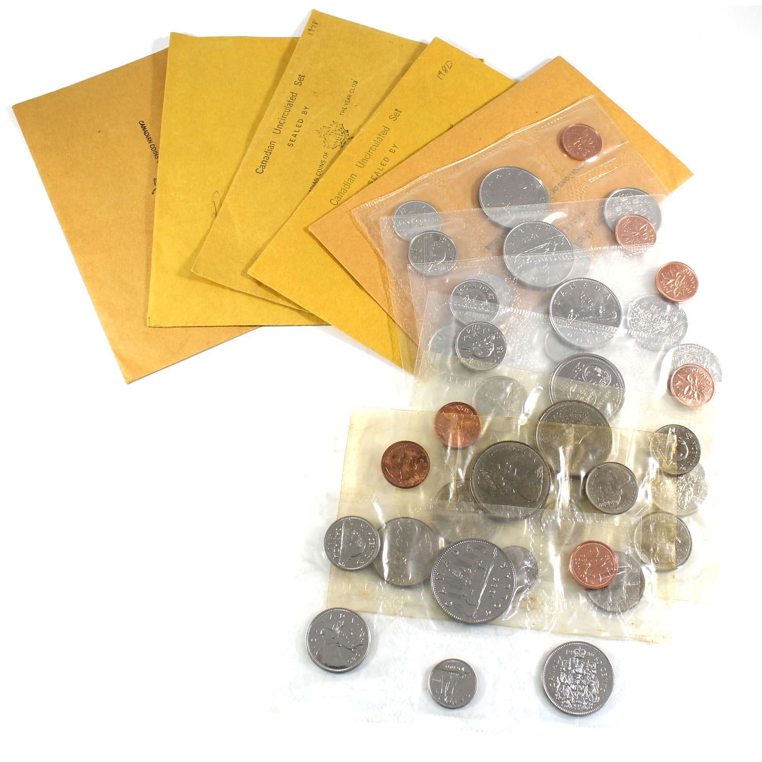 Estate Lot of 1972-1986 Year sets issued by the Canadian Coins of the Year Club (COTY) & RCM sets. Lot includes: 1972 COTY, 1973 COTY, 1974 Mint Set, 1975 Mint Set, 1976 Mint Set, 1978 Mint Set, 1978 COTY, 1979 COTY, 1980 COTY, 1981 COTY & 1982 COTY & 1986 Mint Set. 12 set