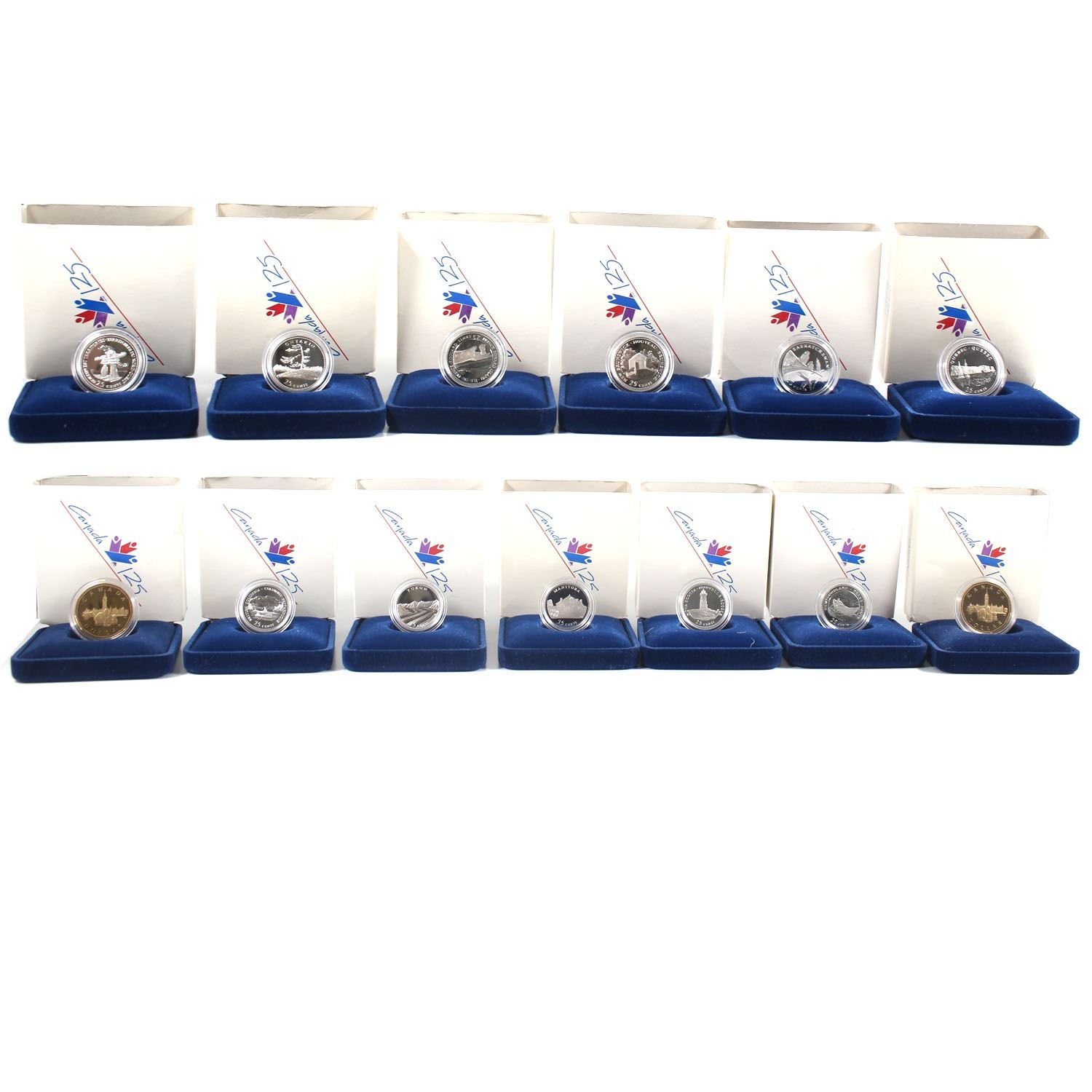 Estate Lot of 1992 Canada 25-cent Sterling Silver Canada 125 Commemorative Coins. You will receive all the provinces except Alberta and includes 2x 1992 Parliament Proof Loon Dollars. 13pcs