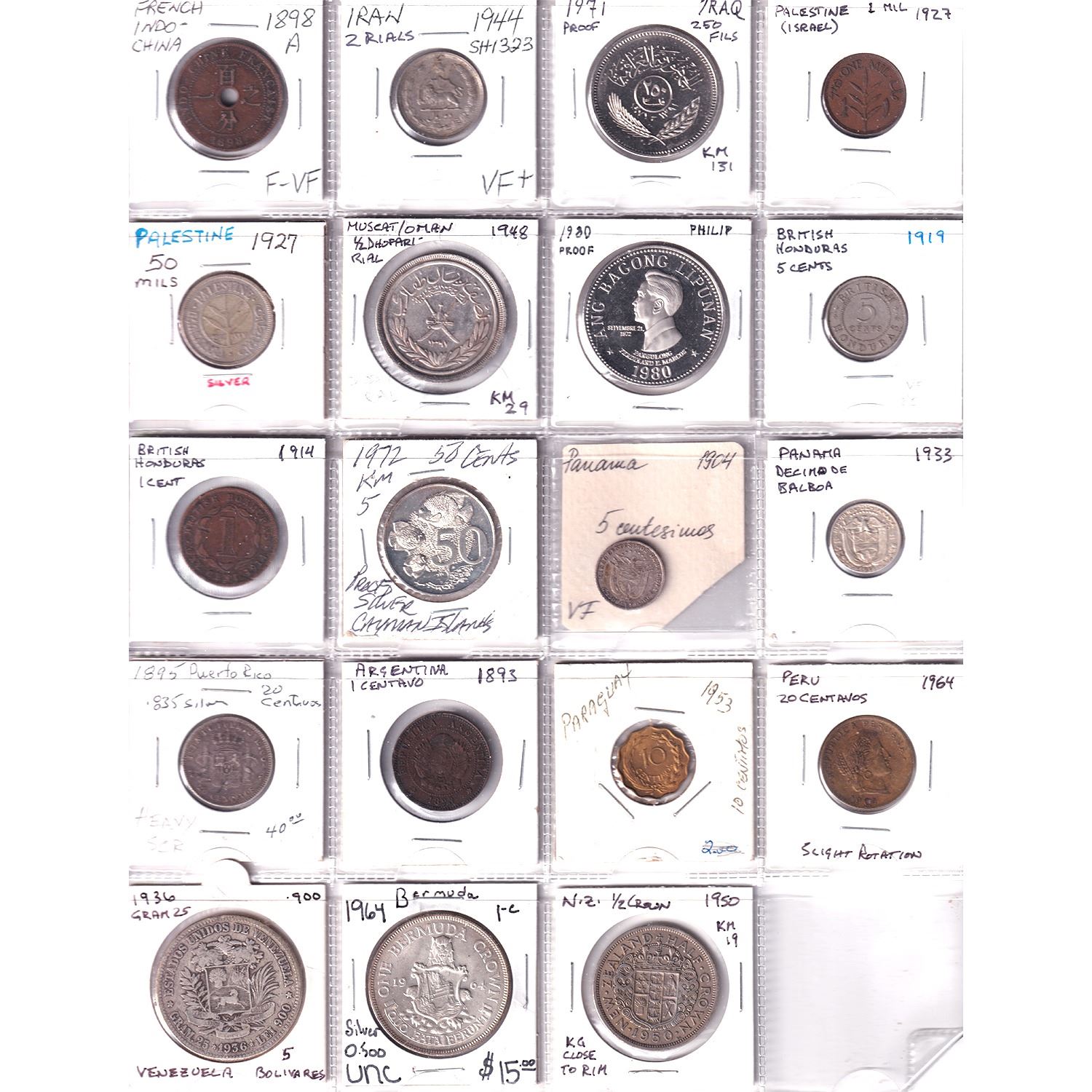 Estate Lot of 19x 1893-1980 Mixed World Coinage. You will receive 1893 Argentina 1 Centavo, 1895 Puerto Rico 20 Centavos, 1898A French Indo-China, Panama - 1904 5 Centesimos, 1933 Decimo de Balboa, British Honduras - 1914 1 Cent, 1919 5 Cents, Palestine - 1927 1 Mil, 1927 50 Mils, 1936 Venezuela 5 Bolivares, 1944 Iran 2 Rials, 1948 Muscat/Oman 1/2 Dhofari Rial, 1950 New Zealand 1/2 Crown, 1953 Paraguay 10 Centimos, 1964 Peru 20 Centavos, 1964 Bermuda 1 Crown, 1971 Iraq 250 Fils, 1972 Cayman Islands 50 Cents & 1980 Phillipines 5 Piso. 19pcs