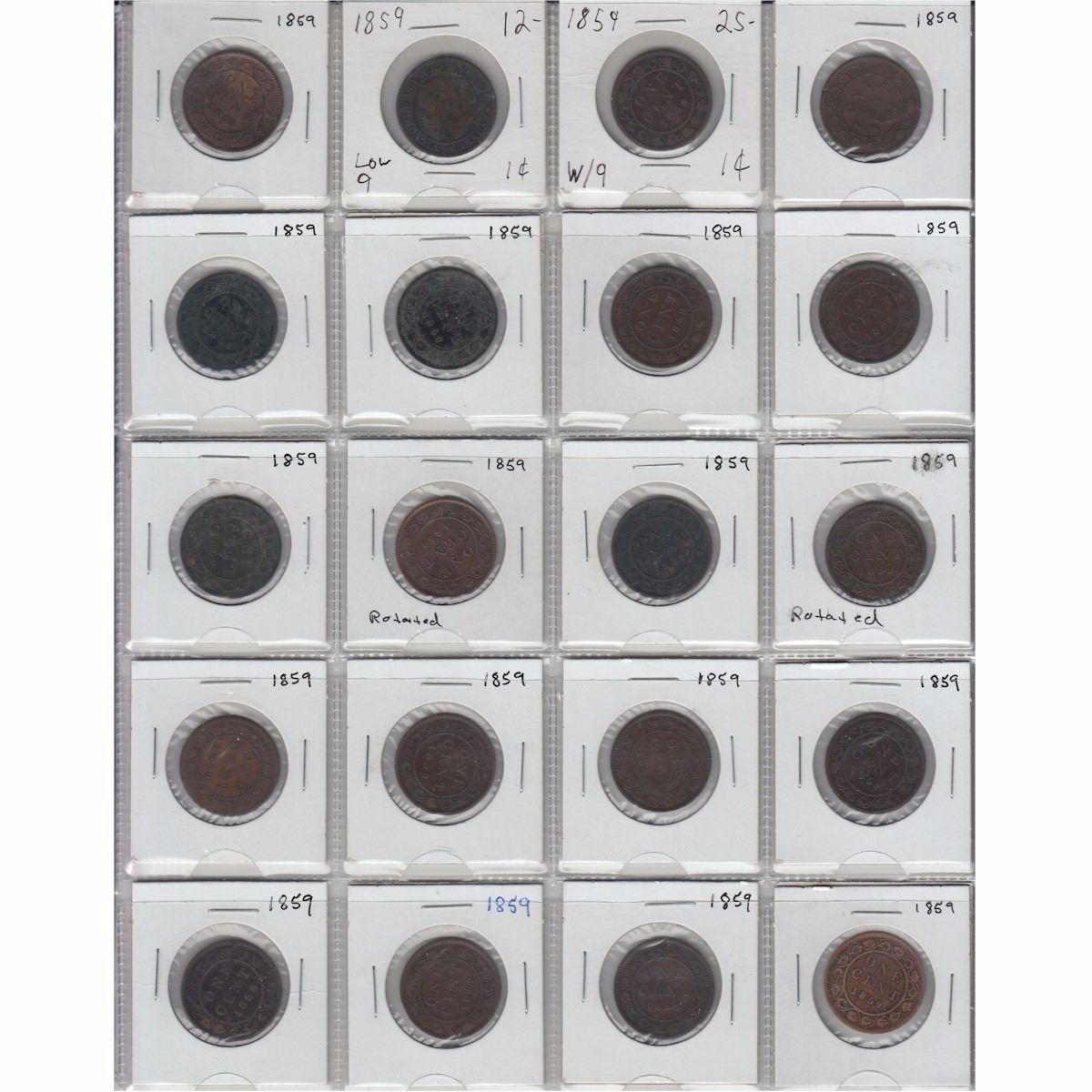 Estate Lot of 20 x Mixed 1859 Canadian 1-cent coins, including some Variety pieces as indicated on the holders . (20pcs). Buyers Premium will be added on all items as per our terms of sale. We accept Paypal, Credit Card, E-Transfer Payments, Cheque or Money Orders (there is an additional 3% fee for using Paypal or Credit Card). All invoices will be emailed immediately following the auction, please contact us if you would like to pay by credit card or receive a new revised lower total for mailing in payment or sending an e-transfer (3% discount). All Items Are Sold "AS IS", no returns