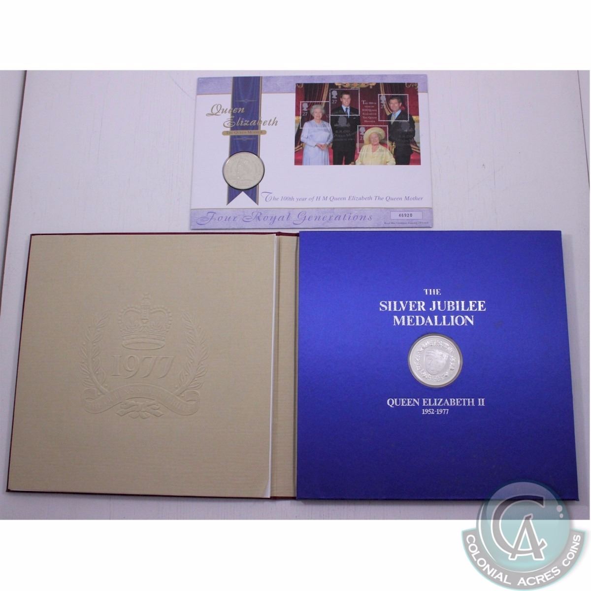Estate Lot of 2x 1977 and 2000 Sets commemorating Queen Elizabeth II. You will receive the following: 1977 Canada "The Medallion Folio of the Silver Jubilee of Queen Elizabeth II" Medallion and 1900-2000 Queen Elizabeth "The Queen Mother" 5 pound coin and stamp set. 1977 outer box contains watermarks, however, set is unharmed. (2 sets)