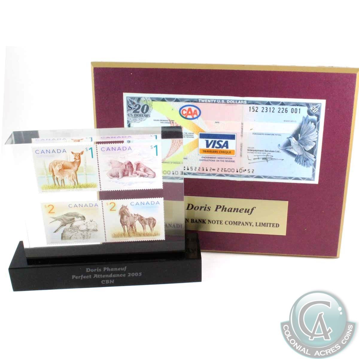 Estate Lot of 2x Canadian Bank Note Company, Limited Perfect Attendance Awards featuring 4x Stamps and a US Travellers Cheque. Included in this lot are: $20 US Dollars Visa Travellers Cheque encased on a plaque and 4x Wildlife $1 and $2 Canadian Stamps encased in Acrylic. (2pcs)