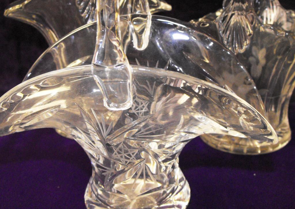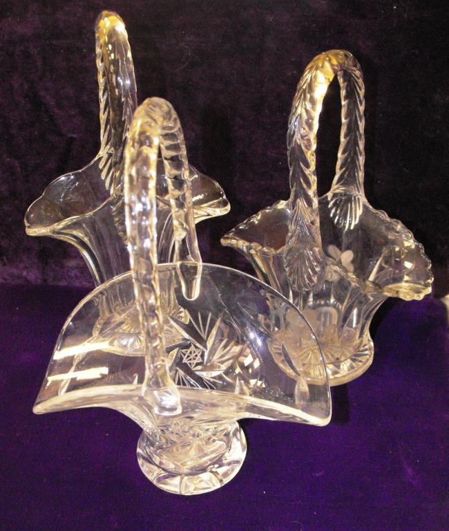 A nice lot of miniature baskets. Two etched with fancy designs. 8" tallest.