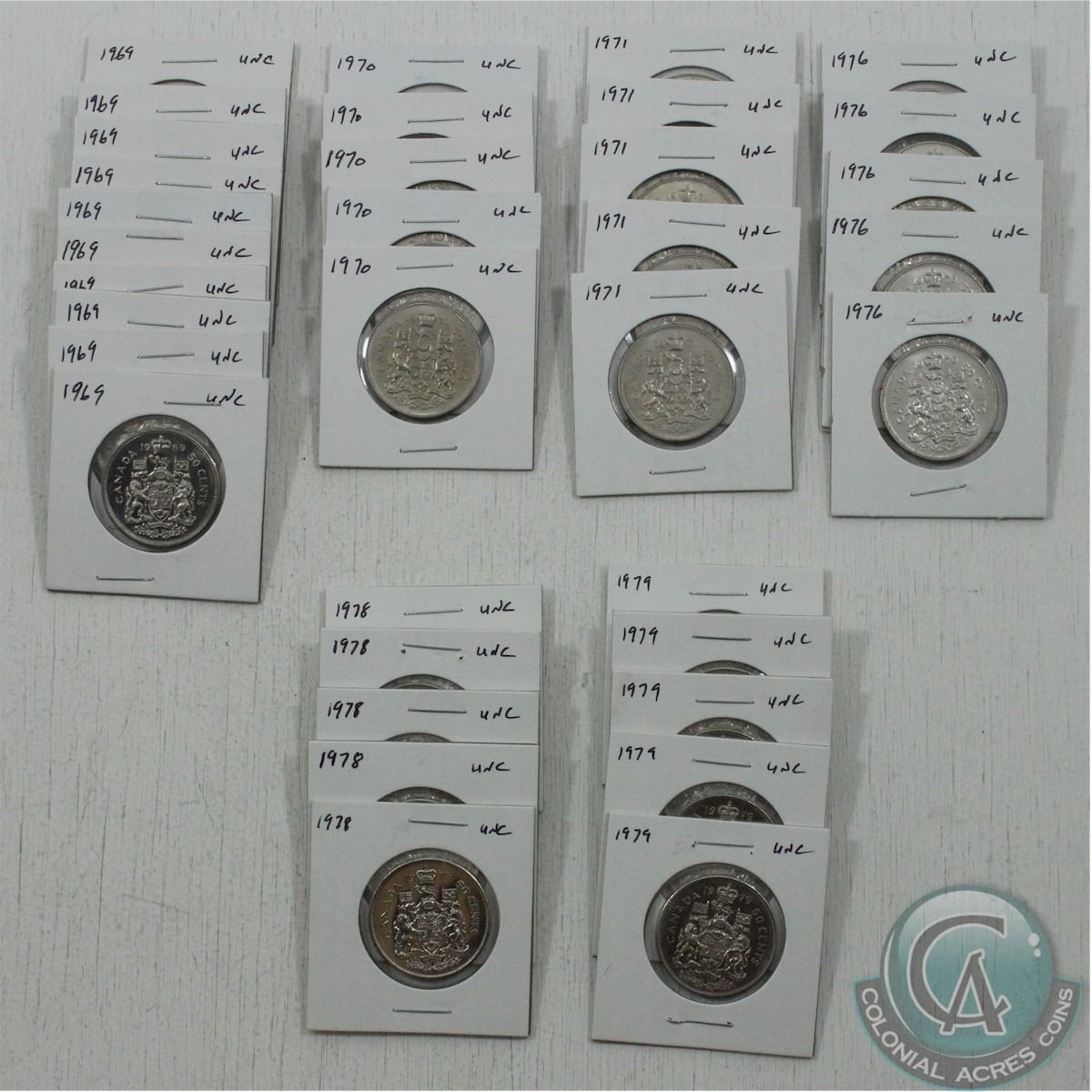 Estate Lot of 35x 1969-1979 Canada Uncirculated 50-cent coins in 2X2's. You will receive a complete 10x 1969, 5x 1970, 5x 1971, 5x 1976, 5x 1978, and 5x 1979 coins from uncircualted Roll (35 pcs)