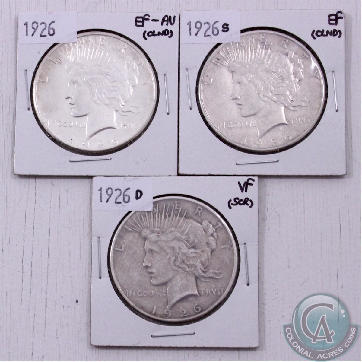Estate Lot of 3x 1926 US American Peace Dollars. You will reiceve the: 1926, 1926(S) and the 1926(D). Coins come in a 2x2 cardboard holder. (3pcs)