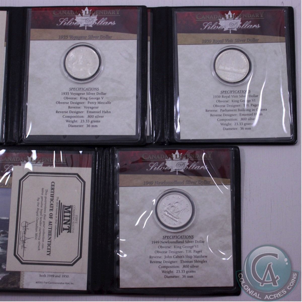 Estate Lot of 3x 1935-1949 First Commemorative Mint Silver Dollars. This lot includes the 1935 Voyageur, 1939 Royal Visit and 1949 Newfoundland Silver Dollars. Each coin comes in a black leatherette book with COA. (3pcs)