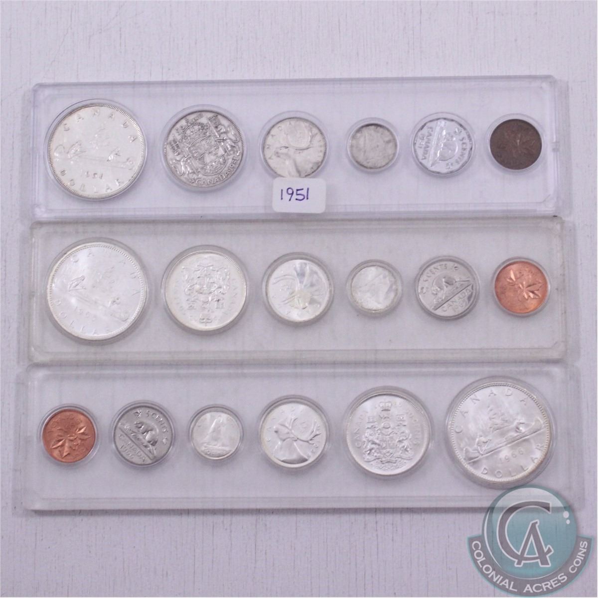 Estate Lot of 3x 1951-1966 Canada 6-coin Silver Year Sets in Snap Lock Cases. The dates you will receive are: 1951, 1965 and 1966. Some coins are toned and coins come in a hard-plastic case. (3pcs)