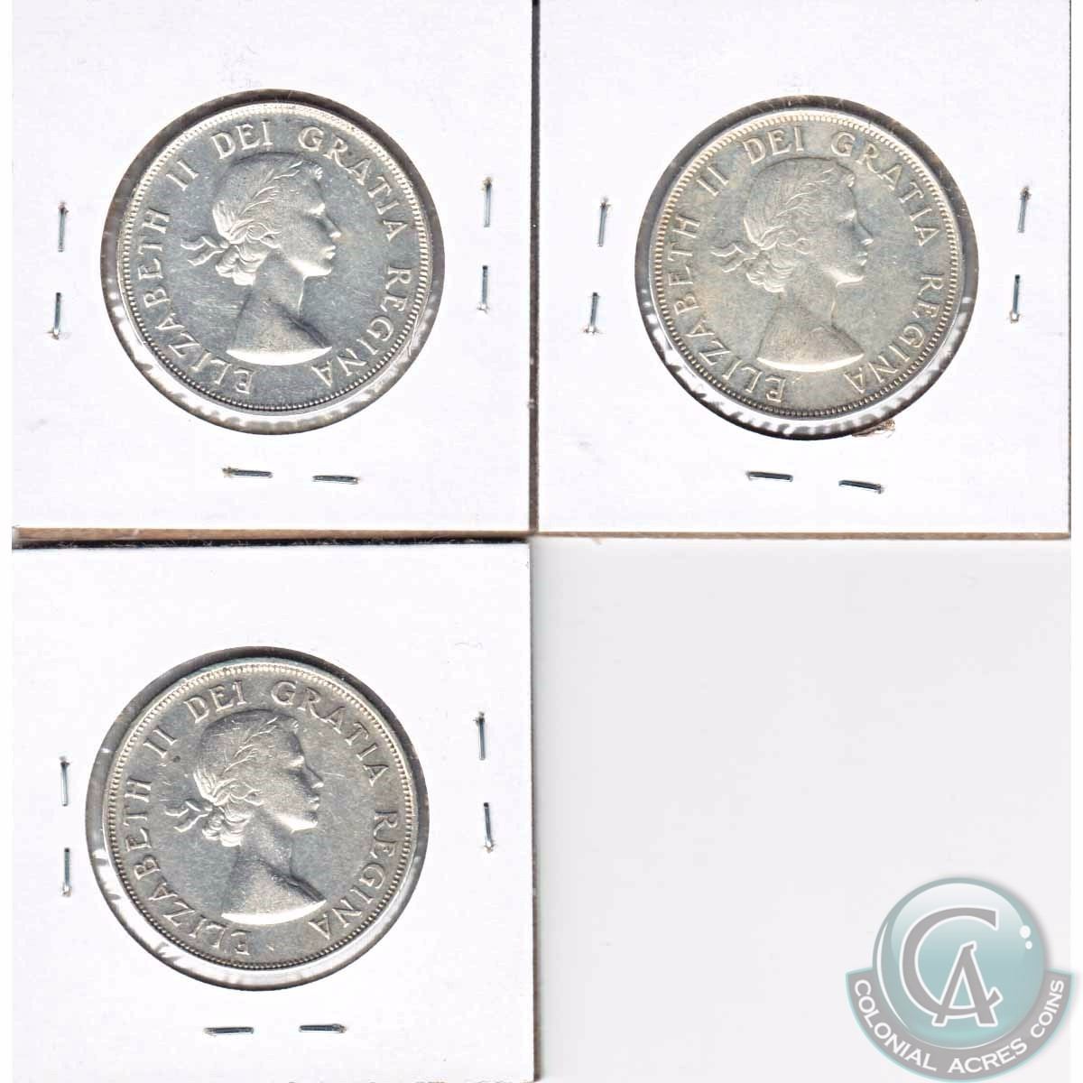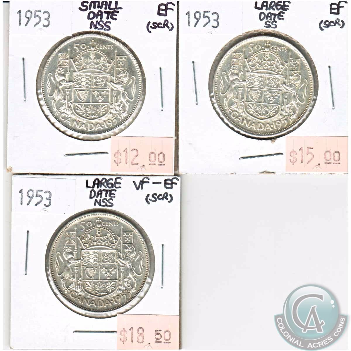 Estate Lot of 3x 1953 Canadian 50-cent Coins. The varieties you will receive are: Small Date NSS, Large Date SS and Large Date NSS. (3pcs)