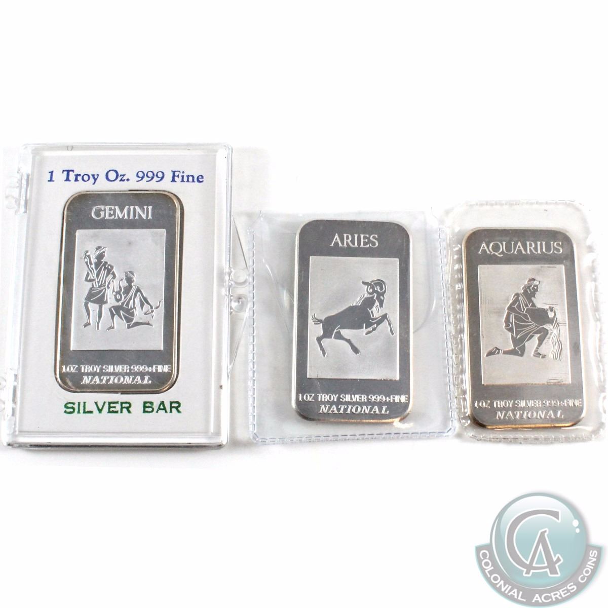 Estate Lot of 3x Commemorative Zodiac 1oz .999+ Fine Silver Bars (Tax Exempt). You will receive the following Zodiac signs: Aquarius, Aries and Gemini. 3pcs