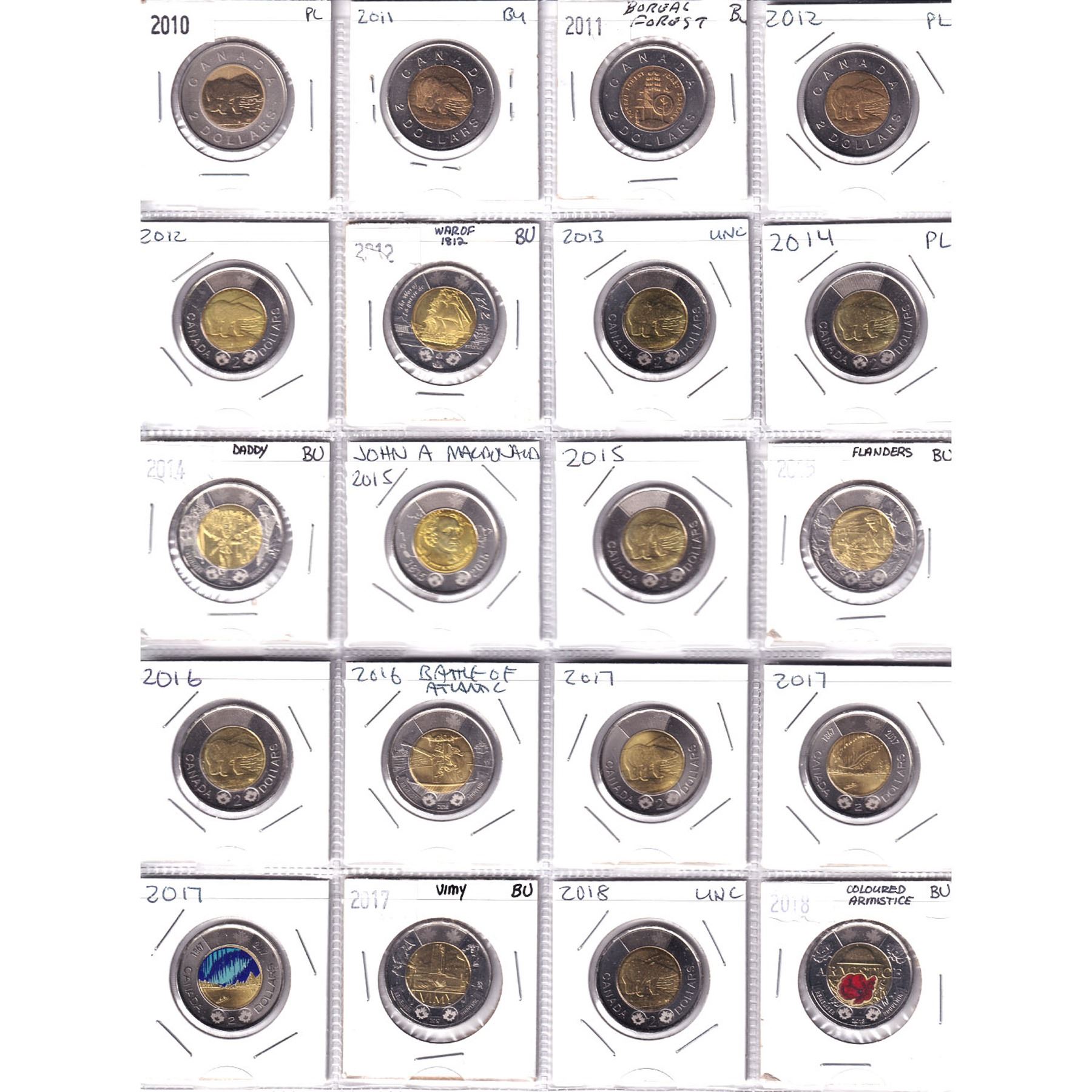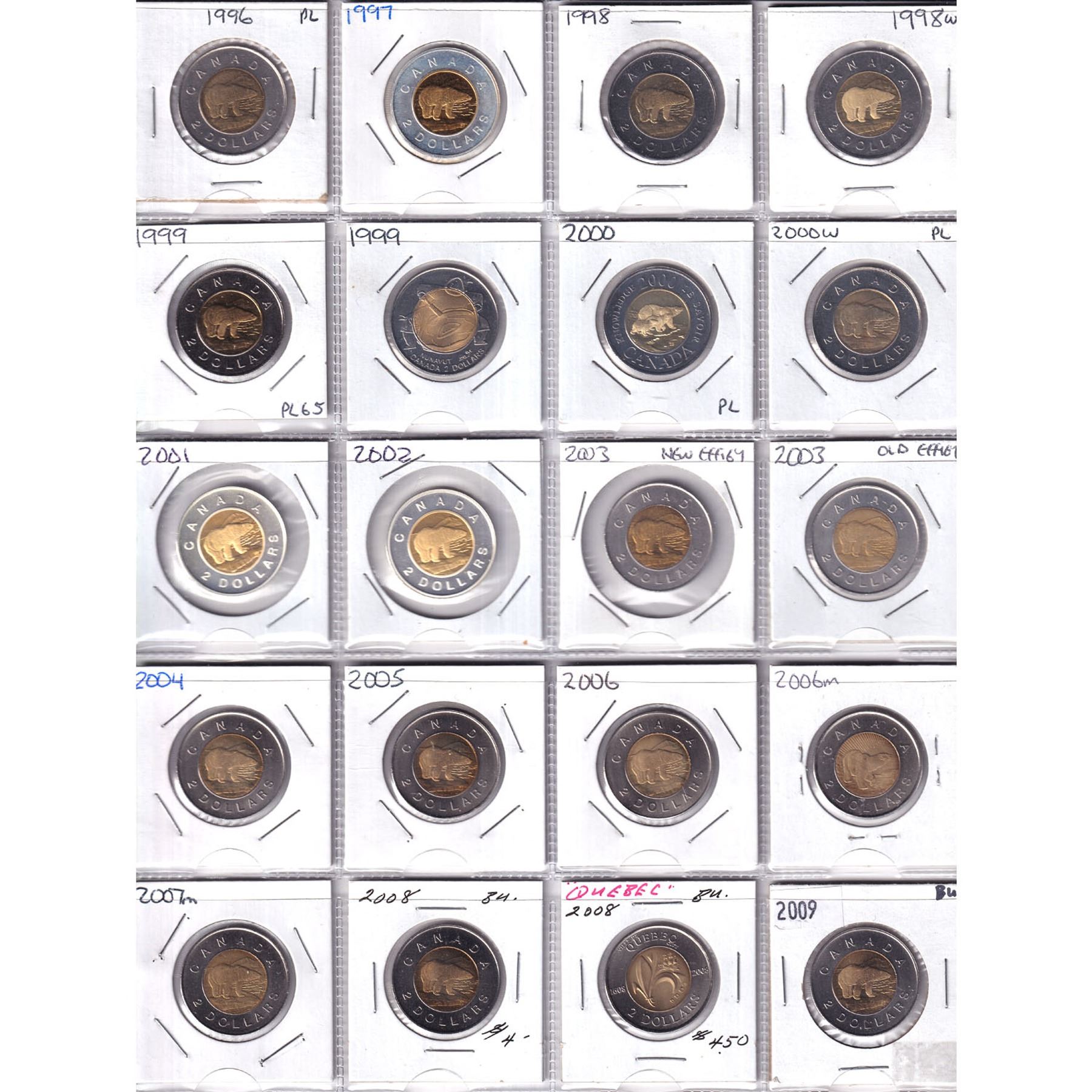 Estate Lot of 44x Canadian $2 coins from 1996-2019. Lot Includes: 1996, 1997 Silver PR, 1998, 1998W, 1999 PB, 1999 Nun., 2000, 2000W, 2001 Silver Proof, 2002 Silver Proof, 2003 O.E, 2003 N.E, 2004, 2005, 2006, 2006M, 2007, 2008, 2008 Quebec, 2009, 2010, 2011, 2011 Boreal Forest, 2012 Old Gen., 2012 New Gen, 2012 War 1812, 2013, 2014, 2014 Daddy, 2015 John A Macdonald, 2015, 2015 Flanders, 2016,2016 Battle Atlantic, 2017, 2017 N.L, 2017 Coloured N.L, 2017 Vimy, 2018, 2018 Coloured Armistice, 2018 Armistice, 2019, 2019 Coloured D-Day, & 2019 Coloured D-Day. Looking to get a near complete $2 Collection? Here it is! Good Luck!