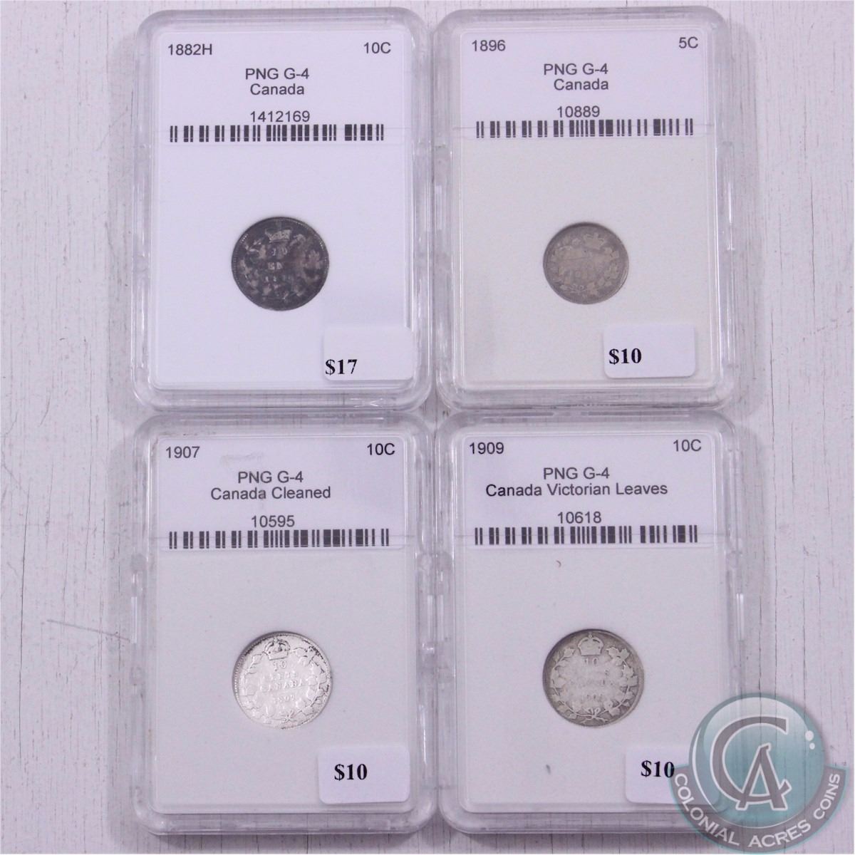 Estate Lot of 4x 1882-1909 Canadian 5-cent and 10-cent PNG Certified Coins in G-4 Condition. The dates included in this lot are: 1882H 10-cent, 1896 5-cent, 1907 10-cent (Cleaned) and 1909 10-cent Victorian Leaves. Please note that the 1896 nickel is scratched. (4pcs)