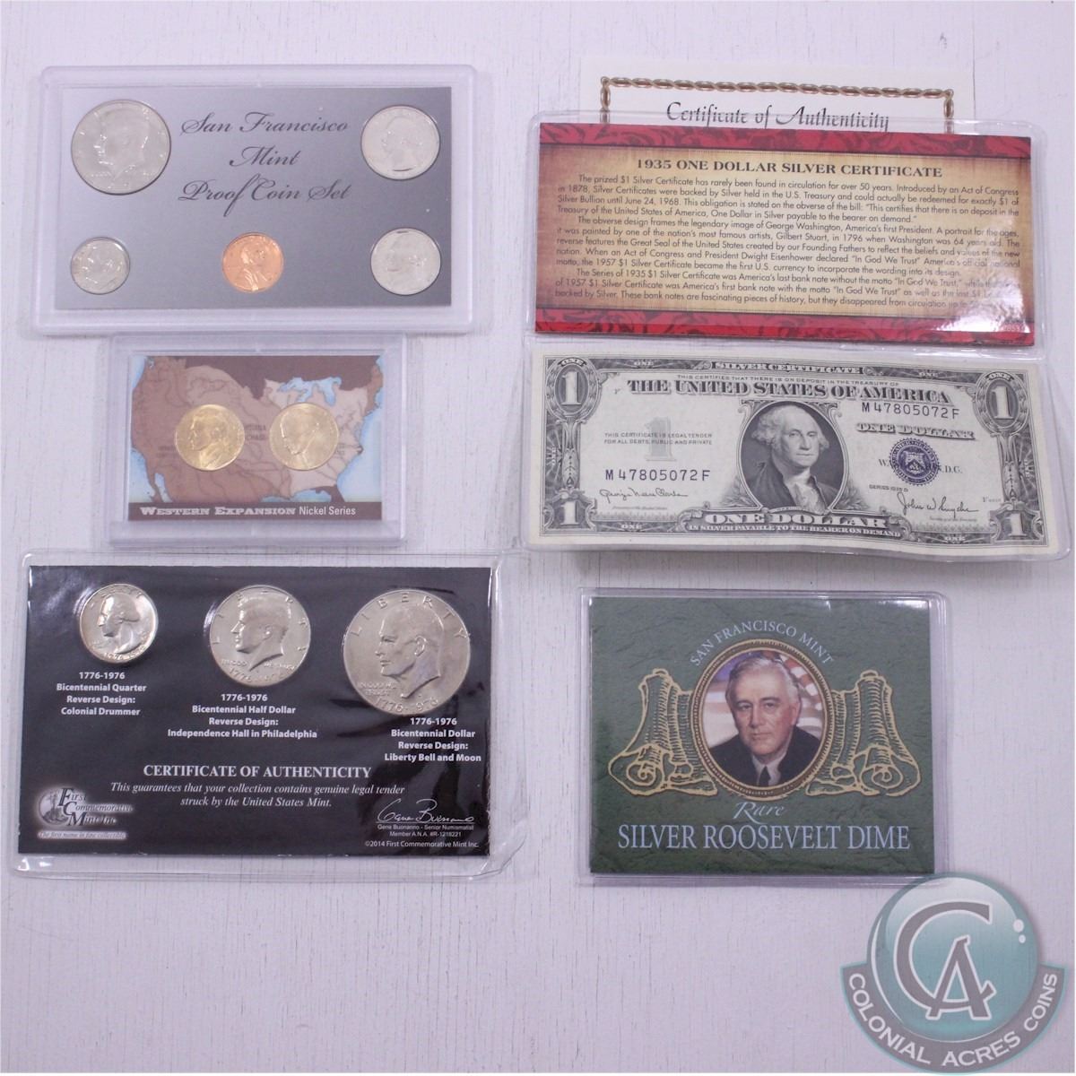 Estate Lot of 4x 1955-1976 United States Miscellaneous Commemorative Coin Sets with bonus 1935 United States $1 Silver Certificate. Please view image. (5pcs)