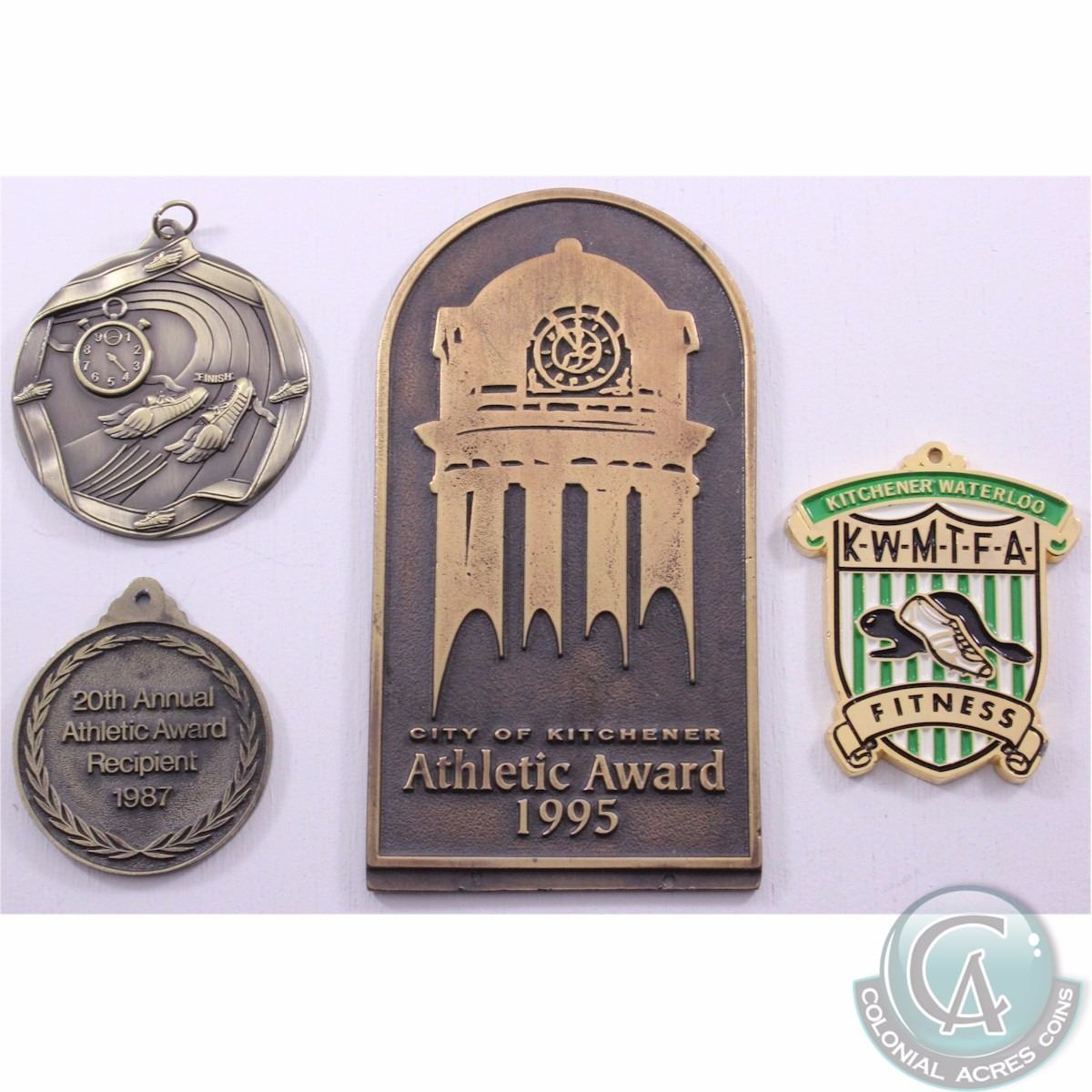 Estate Lot of 4x Athletic award Medals. This lot includes the following medallions: Kitchener Waterloo KWMTFA Fitness medal, Kitchener-Waterloo KWTFA Track and Field Medal, 1995 City of Kitchener Athletic Award and the 1987 city of Kitchener 20th Annual Athletic Award recipient Medal (4 pcs)