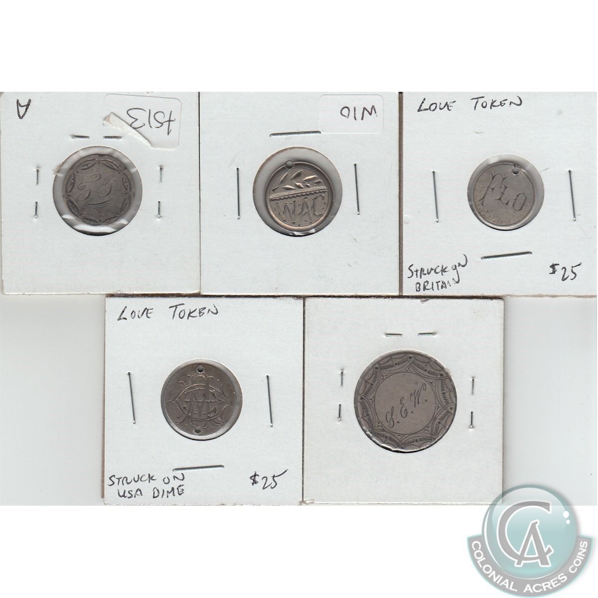 Estate Lot of 5x Different Silver Love Tokens. You will receive 2x love Token struck on a US dime, one Struck on a Great Britain 3-pence, one Canadian love Token struck on a dime, and one US love Token struck on a Quarter Dollar coin (5 pcs)