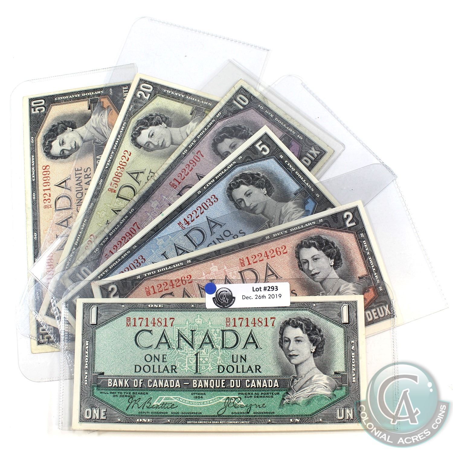 Estate Lot of 6x 1954 $1 to $50 Bank of Canada Notes. You will receive $1 BC-37a-i prefix B/M; VF-EF, $2 BC-38a prefix N/B; AU, $5 BC-39b prefix M/S; UNC, $10 Devil's Face BC-32a prefix C/D; F-VF, $20 BC-41b prefix G/W; UNC & $50 BC-42b prefix B/H; VF. 6pcs