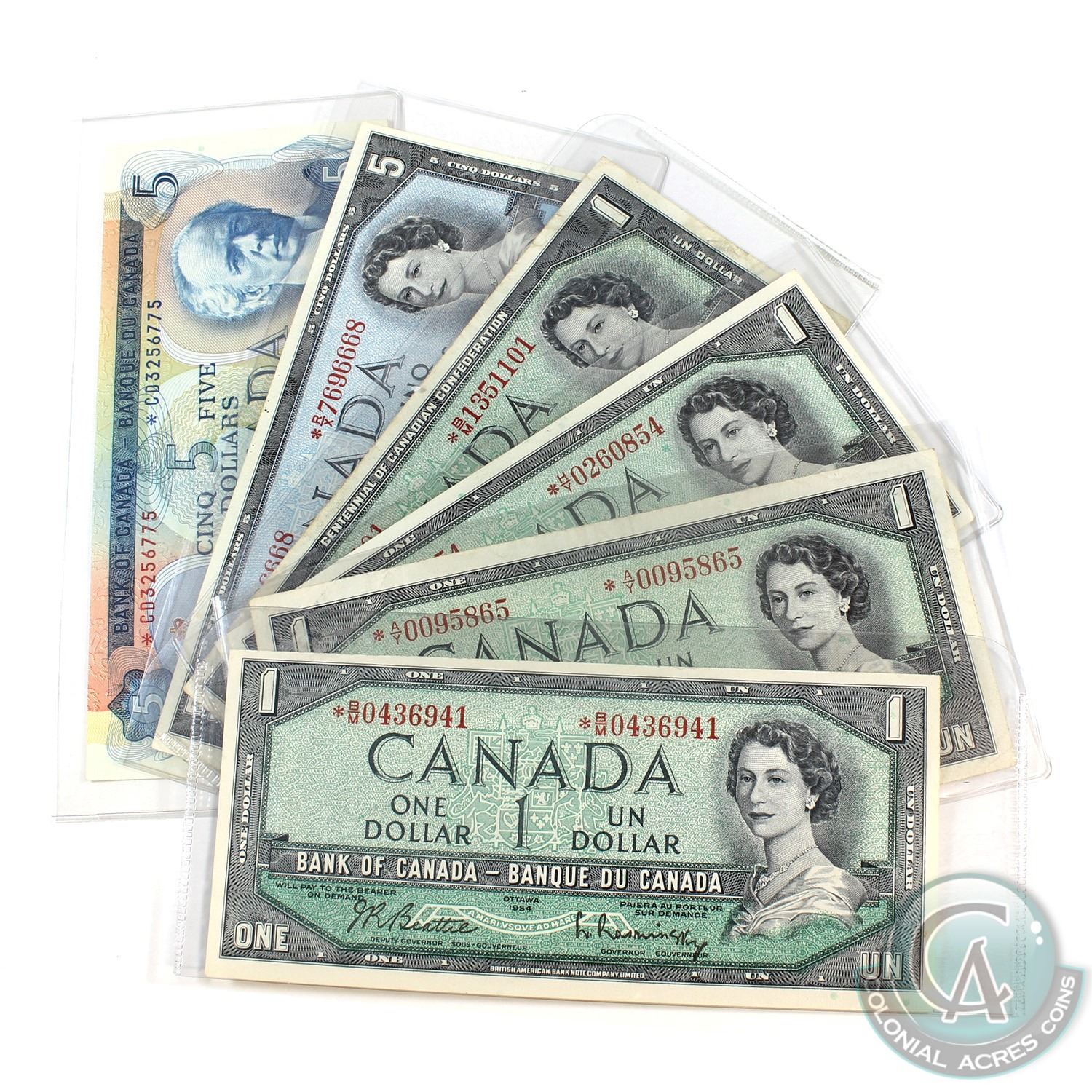 Estate Lot of 6x Bank of Canada $1 & $5 Replacement Notes. You will receive 1954 $1 BC-37bA-i prefix *B/M; AU-UNC, 1954 $1 BC-37bA prefix *A/Y; VF, 1954 $1 BC-37bA prefix *H/Y; EF, 1967 $1 BC-45bA-i prefix *B/M; VF, 1954 $5 BC-39cA prefix *R/X above 7640000; VF-EF & 1972 $5 BC-48aA prefix *CD; VF-EF. 6pcs