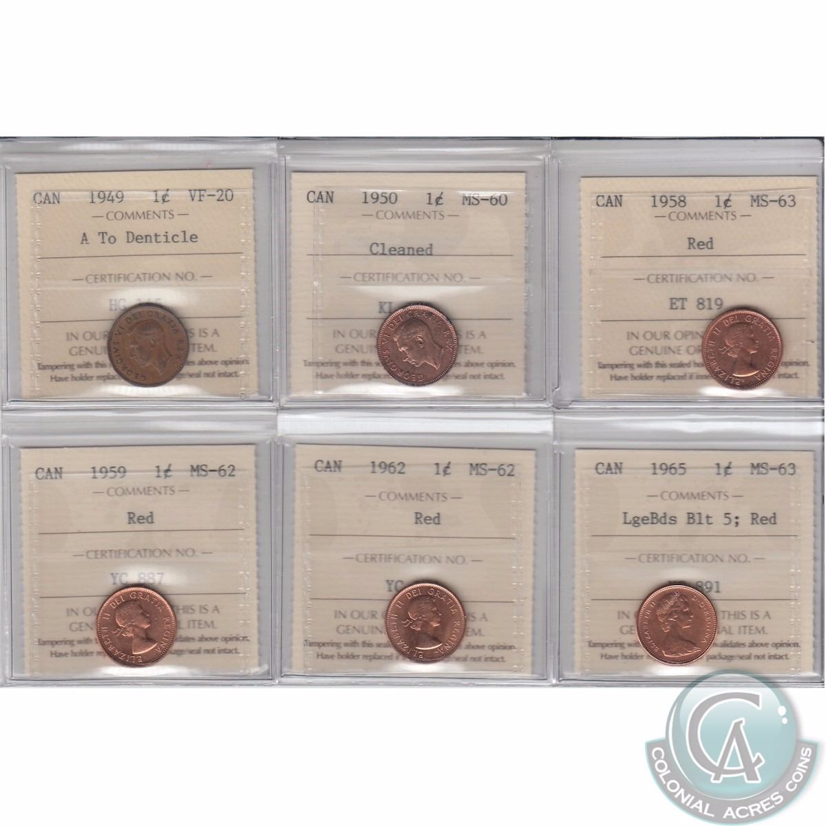 Estate Lot of 6x Canadian ICCS Certified 1-cent coins. This lot includes the following ICCS Certified 1-cent coins: 1949 A to Denticle VF-20, 1950 MS-60 (cleaned), 1958 MS-63, 1959 MS-62, 1962 MS-62 and the 1965 Large Beads BLT 5 MS-63. 6pcs