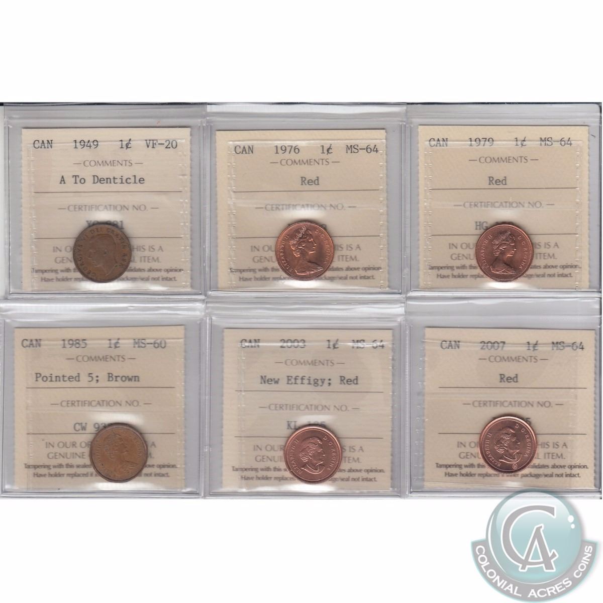 Estate Lot of 6x Canadian ICCS Certified 1-cent coins. This lot includes the following ICCS Certified 1-cent coins: 1949 A to Denticle VF-20, 1976 MS-64, 1979 MS-64, 1985 Pointed 5; Brown MS-60, 2003 New Effigy MS-64 and the 2007 1-cent MS-64. 6pcs