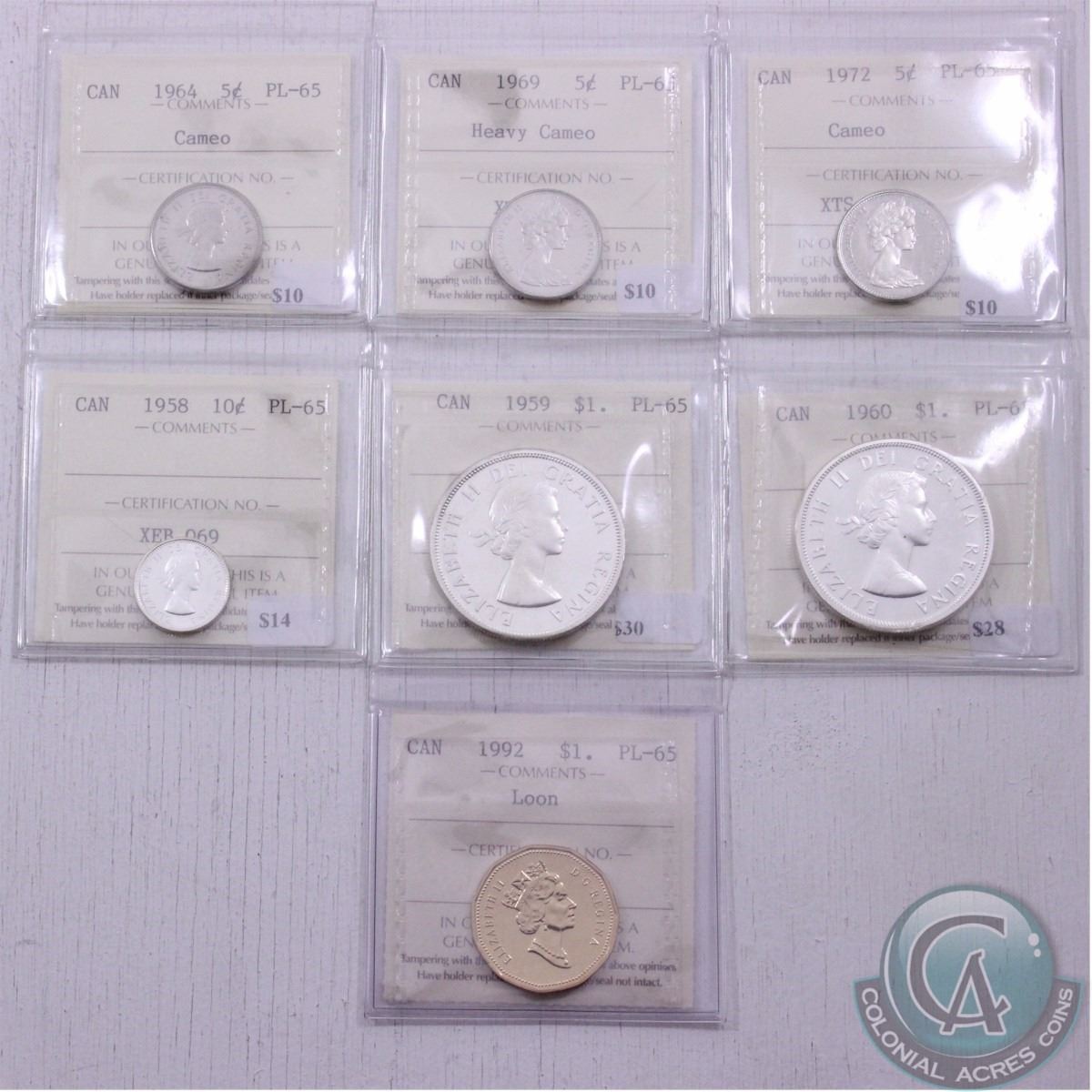 Estate Lot of 7x 1958-1992 Canadian ICCS Certified Coins in PL-65 Condition. The years and denominations included in this lot are: 1958 10-cent, 1959 Silver Dollar, 1964 5-cent Cameo, 1960 Silver Dollar Cameo, 1969 5-cent Heavy Cameo, 1972 5-cent Cameo and lastly, 1992 Loonie. (7pcs)