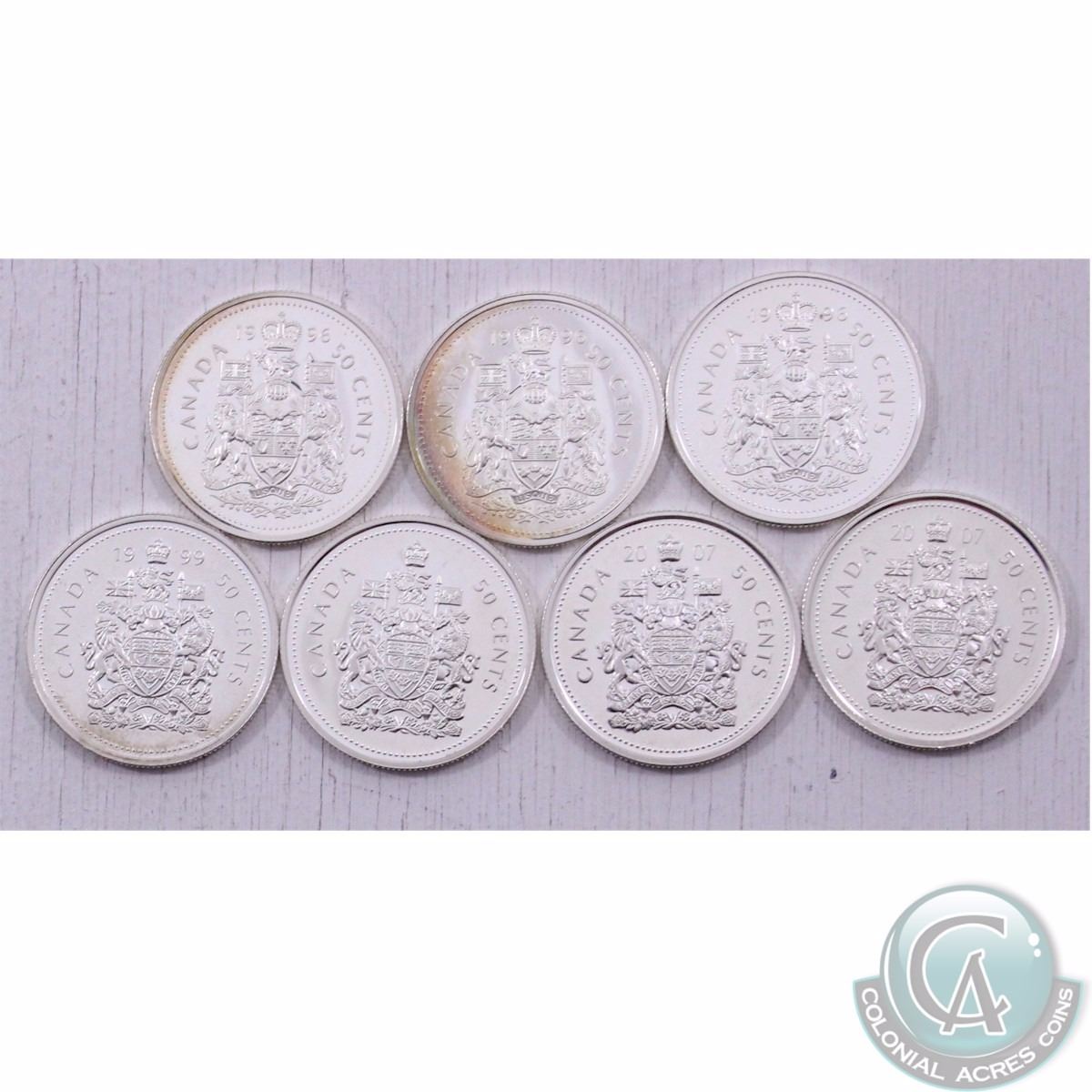 Estate Lot of 7x 1996-2007 Canadian 50-cent coins. The dates included in this lot are: 3x 1996, 1999, 1952-2002 Double dated 50-cent and 2007. Coins contain natural toning. (7pcs)